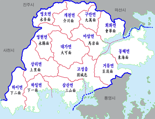 경상남도 고성군은 남해안에 남해군과 인접하게 위치하고 있다. 고성군은 거제시, 사천시, 통영시 등 경상남도의 타 도시에 비하여 남해군과 면적, 인구 등이 비슷하며, 2019년 소멸군 위험 지수 0.254이다. 고성군의 관광지는 주로 박물관, 공원 등으로 이루어져 있다. 한 달 살기 지원 프로그램 등을 통하여 고성군 또한 관광산업 활성화에 대한 의지를 갖고 있음을 알 수 있었다.