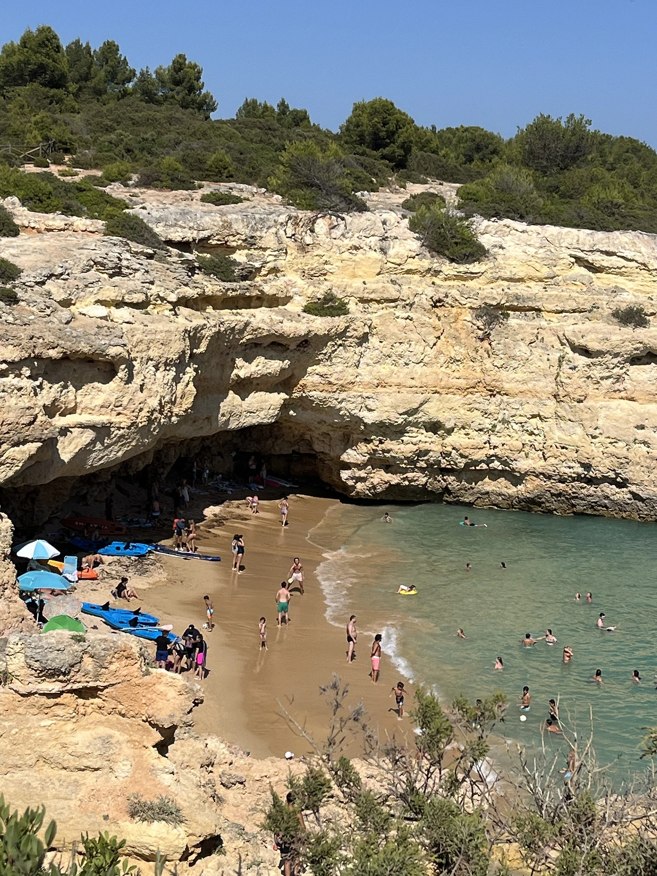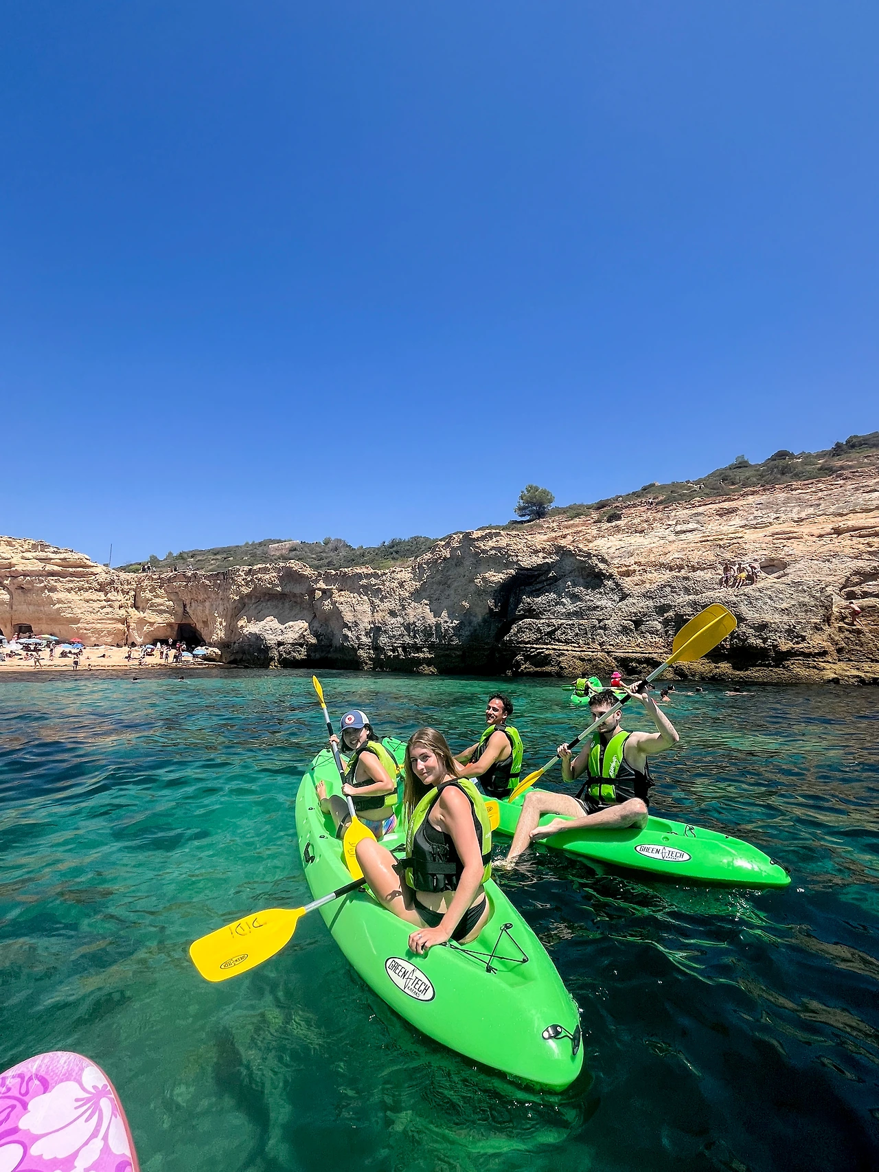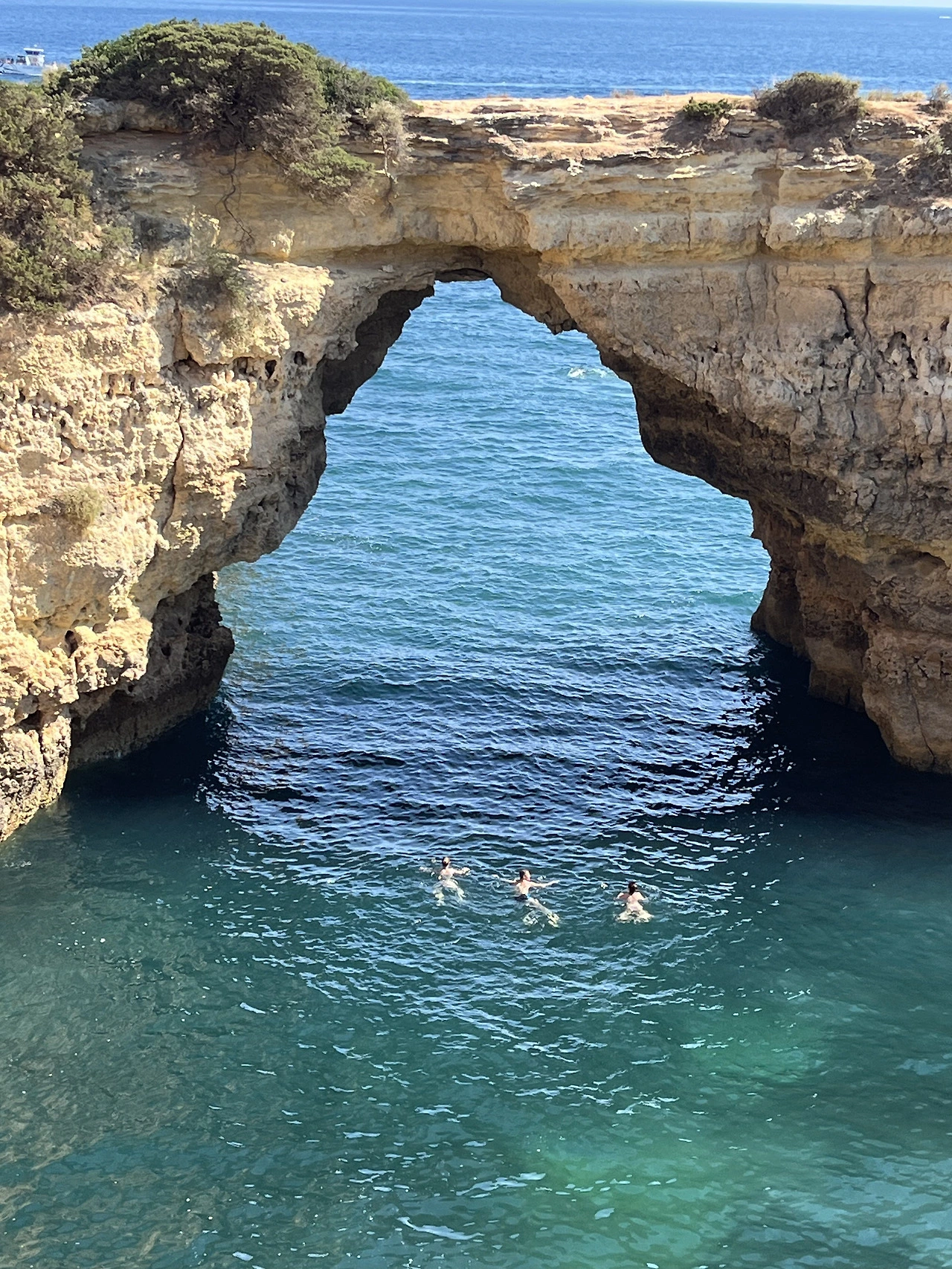 사진만큼 아름다웠던 베나길 동굴은 그만의 매력이 있었지만, 붐비는 관광객과 좁고 어두운 동굴 속에서 부딪히는 카약들, 다소 위험하게 지나가던 보트를 피하느라 체력 소모가 컸다. 그래서였을까. 모두에게 베나길이 가장 기대되는 장소였음에도, 베나길 근교의 한 프라이빗한 해변가를 더 마음에 담았던 것이. 넷은 이곳에 오자마자 동시에 푹 빠져들어 몸을 재빨리 움직였다. 물이 이끄는 곳으로. 햇빛에 바랜 듯한 연한 갈색의 돌계단을 성큼성큼 내려갈 때마다, 선명해지는 바다의 모습에 발을 헛디디지 않도록 조심해야 했다. 둥글게 바다를 감싸고 있는 듯한 절벽 아래, 흘러들어오는 바닷물의 모습을 본다면 누구나 감탄을 그치기 어려웠을 것이다. 지금껏 수없이 뛰어든 지중해, 홍해, 아드리아해 등 다양한 바다를 누비었음에도, 바다는 한결같이 설렘을 안겨주었다. 그날의 바다도 빼놓을 수 없고말고. 지금까지 대서양과 맞닿아 있는 포르투갈에서 본 바다의 색깔은 진하고 어두운 청색에 가까웠다. 하지만 바다에서 보내는 시간 중, 가장 좋아하는 시간대인 4시 이후에 도착한 만큼 ‘Praia de Albandeira’ 해변은 푸르른 지중해의 모습을 연상시켜 주었다. 진한 청색물에 하얀색이 섞여 풀어진 듯, 연해진 푸르스름한 바닷물이 나의 두 발로 들어왔다. 오랜만에 마주하는 파스텔 색상의 바다, 아치형 절벽의 품에서 느껴지는 포근함, 해가 서서히 내려오며 느껴지는 따뜻함, 뚜렷해지는 물살의 흐름, 끊임없이 일렁거리는 윤슬. 그리고 이 순간을 공유하고 있는 나와 세 명의 친구까지. 그날의 모든 순간은 찬란했던 이번 여름휴가를 장식하는 하이라이트였다.
