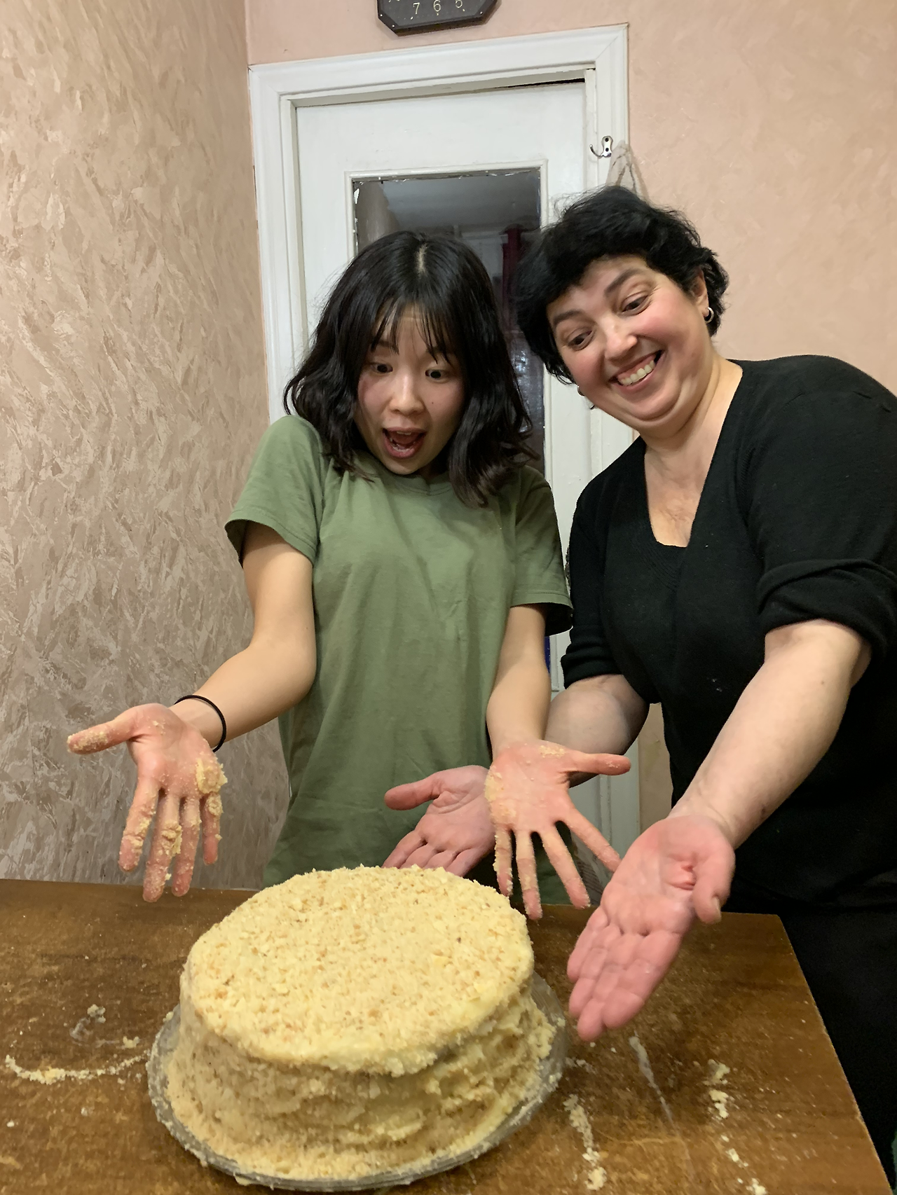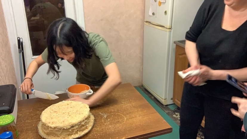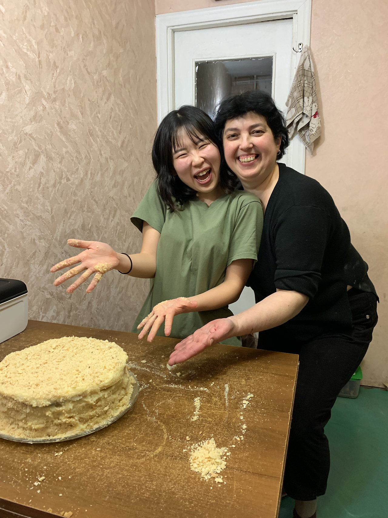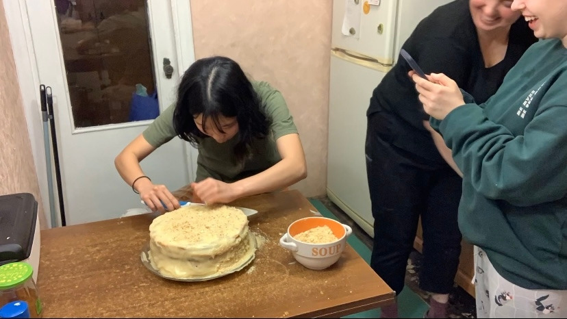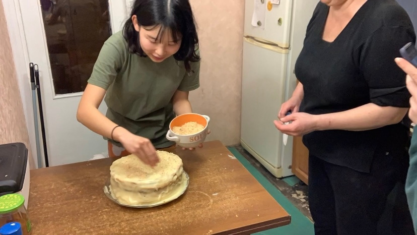 마마가 부엌에서 반죽을 하는 모습을 보고, 처음에는 케이크를 만드시는지 몰랐다. 나에게 케이크를 만든다는 건 전혀 상상도 할 수 없었던 일이었다. 물론 옛날에 케이크 시트에 취향껏 토핑을 뿌리며 데코한 경험은 있지만, 케이크 만들기의 경험은 이게 전부이다. 매장에서 완성된 케이크만 먹었던 내게는 정말 이색적인 모습이었고, 이 제빵을 매년 하신다는 점에 한 번 더 놀랐다. 옆에서 가만히 보며 있다가, 조심스럽게 "마마, 제가 도와드릴까요? 제가 할 수 있는 게 있을까요?"라고 여쭤보았고, 바로 보조 제빵사로 발탁되었다. 반죽은 이미 마마께서 다 해주신 덕분에 반죽을 망치는 일은 없었고, 펼쳐진 반죽을 하나씩 쌓아 올려가며 나팔레온의 형태를 만들어갔다. 그리고 마마만의 노하우가 들어간 고소한 빵가루를 살살 묻혀가며 케이크를 완성해 나갔다. 사실 마마께서 하셨으면 십 분이면 충분히 다 끝냈을 수도 있지만 마마는 답답할 수도 있는 나의 엉거주춤한 손과 어설픈 자세로 임하는 모습을 귀엽게 봐주시면서 옆에서 내가 해낼 수 있을 때까지 천천히 도와주셨다. '글라스!!(좋아!!)'라는 연이은 칭찬과 함께 새로운 가정에서 새로운 연말 전통을 경험하였다.