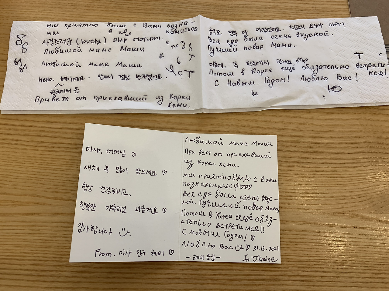 새해가 되어, 숨겨두었던 러시아어로 쓴 편지와 마음을 담은 선물들을 부모님께 하나씩 수줍게 드렸다. 상상 이상으로 마마와 파파는 엄청 행복해하시면서 편지를 읽고, 글라스와 스파시바를 외치면서 나를 꼭 안아주셨다. 나의 마음이 고스란히 그들에게 잘 전해진 것 같아 매우 뿌듯하고, 행복한 밤이었다. '이번만큼은 나도 서프라이즈 성공! 예!'