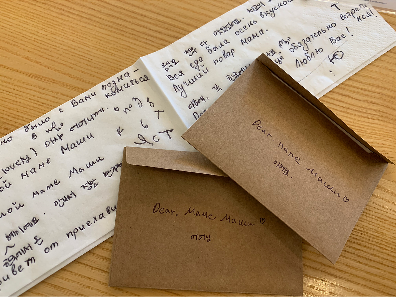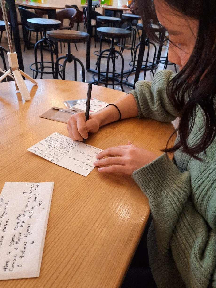 나름 진지한 고민 끝에, 깔끔한 해결책이 나왔다. 먼저, 한국말과 영어로 마샤에게 하고 싶은 말을 이야기한다. 그러면 마샤가 카페에서 준 휴지를 반으로 접어서 한쪽에 러시아어로 적어준다. 그러면 나는 엽서에 바로 옮기기 전에 다른 한쪽에다가 똑같이 따라쓰면서 연습을 해보고, 피드백을 받는다. 거의 그림과 가깝게 느껴지는 지렁이 글씨체가 통과되면 엽서에 한 줄씩 옮겨서 적어 마음을 꾹꾹 눌러 담았다. 비록 한국어를 모르시지만 한국어도 함께 다른 한쪽에 써드렸다. 평소 편지 쓰는 걸 워낙 좋아하다 보니 이번 편지 작업도 시간 가는 줄 모르게 즐기고 있었다. 그리고 이날을 계기로, 앞으로 여행을 다닐 때 언어가 통하지 않는 사람들을 만났더라도 그들의 언어로 작은 마음을 담아 편지 쓰는 나의 전통을 이어나가야겠다는 소망이 생겼다.