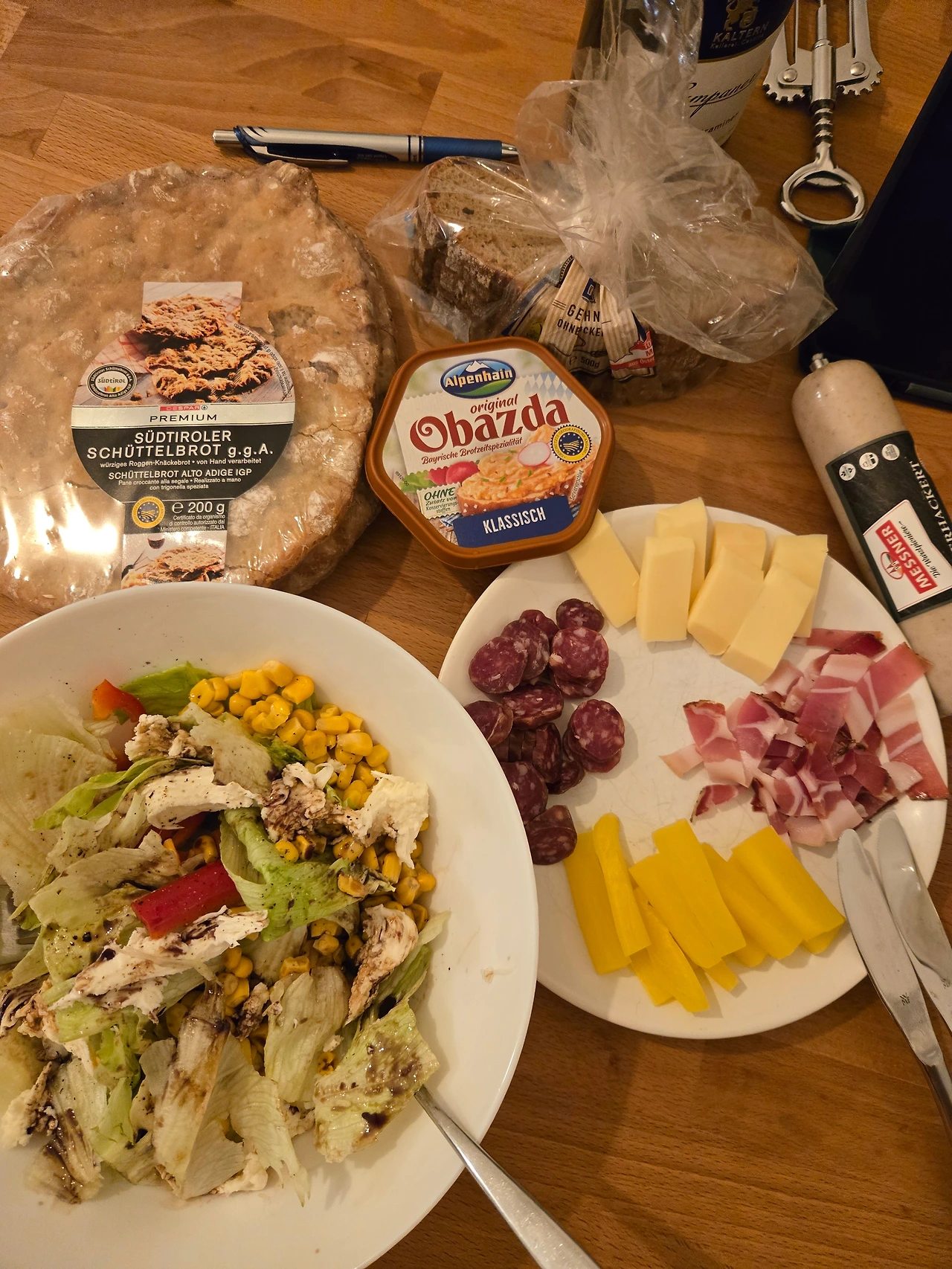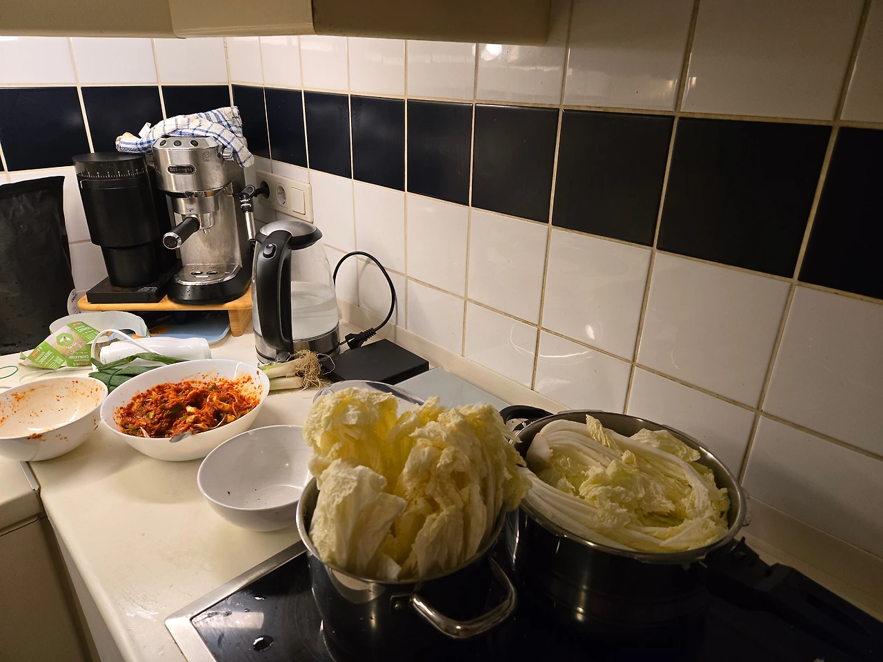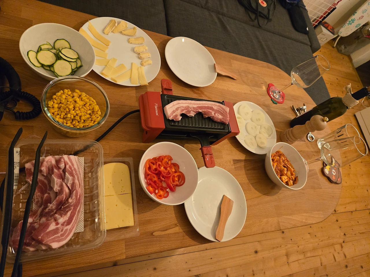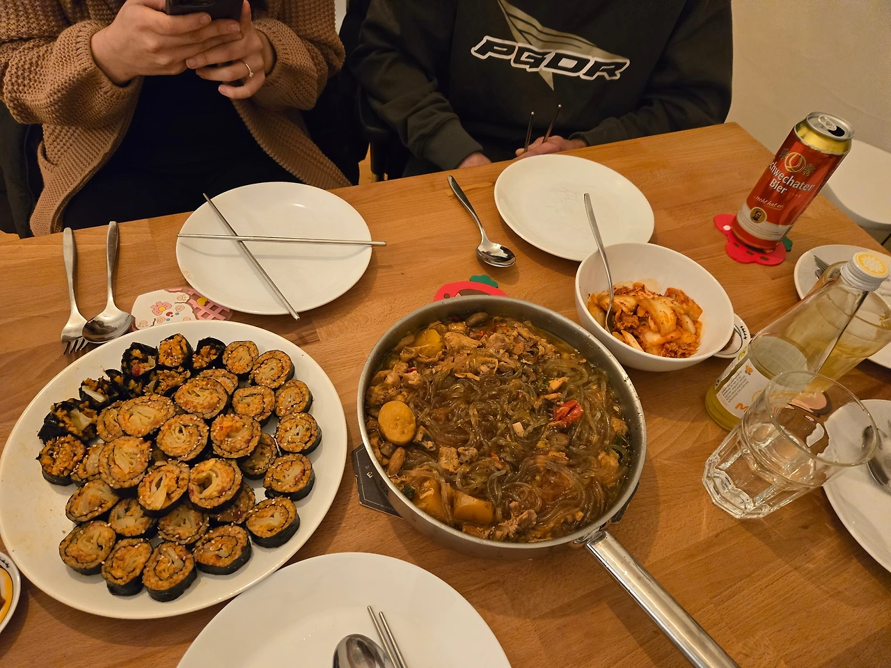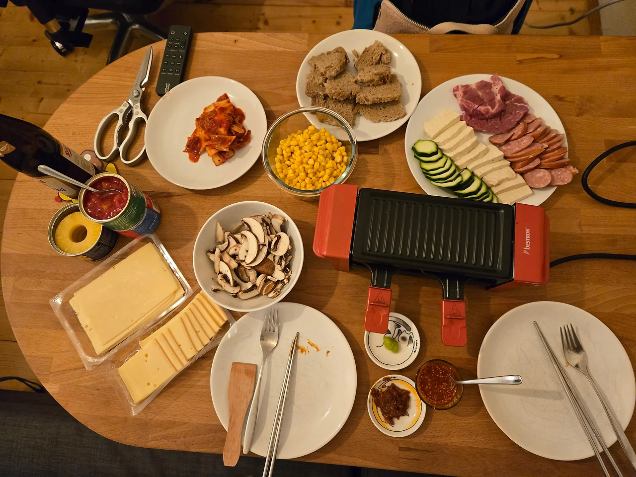 (상하좌우 방향으로) 1. 이 지역 전통음식인 라클렛에 삼겹살을 곁들임 (삼겹살 밑에 오븐처럼 치즈나 야채를 구워 먹는 판이 있음) 2. 직접 담근 김치로 김치찜 3. 전주비빔 삼각김밥맛 스타일로 양배추를 넣고 말은 김밥과 중국당면을 넣은 찜닭 (남자친구의 생일파티 음식이라 외국인의 입맛에 맞춰 빨간색을 토마토와 쌈장으로 냄) 4. 특산품 호박씨 페스토를 넣은 펜네(파스타 이름) 5. 우동사리를 넣은 매운 등갈비 찜 6. 샤워크라우트(양배추 초절임)를 이용한 오코노미야끼 스타일의 부침개 7. Bolzano(볼차노) 지역 전통 빵과 모차렐라치즈 콘 샐러드, 살라미와 프로슈토, 각종 치즈들 8. 토마토 파스타 9. 일본식 카레와 내 김치 10. 크뇌델(비트를 갈아 계란과 향신료 작은 빵조각을 섞은 뒤 뭉쳐서 찜기에 찜)과 고르곤졸라 치즈 베사멜 소스 11. 부대찌개 12. 두 번째 김치 13. 또 라클렛 (이번엔 목살과 두부를 곁들인) 14. 토마토소스 치즈 떡볶이