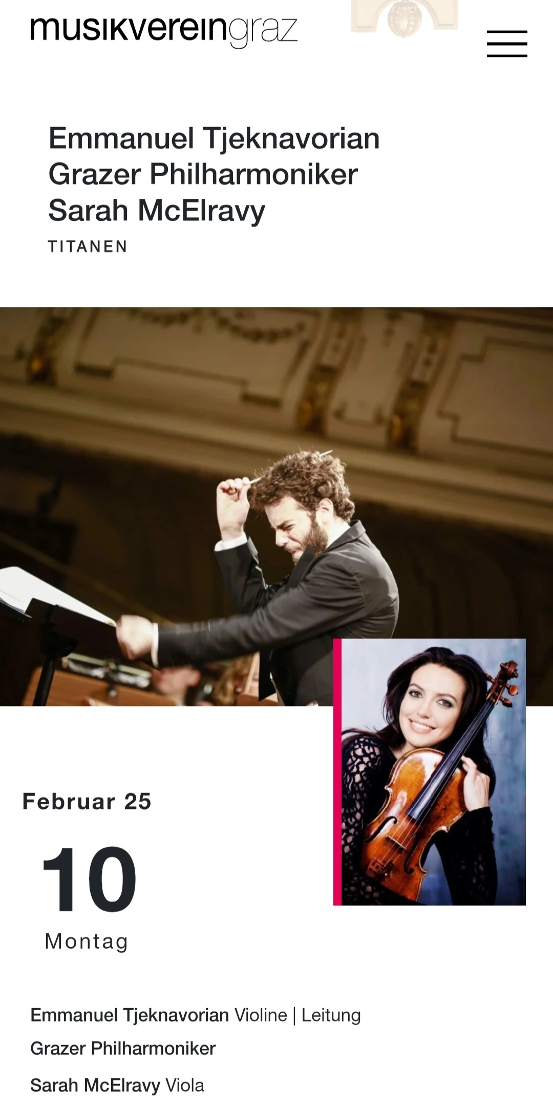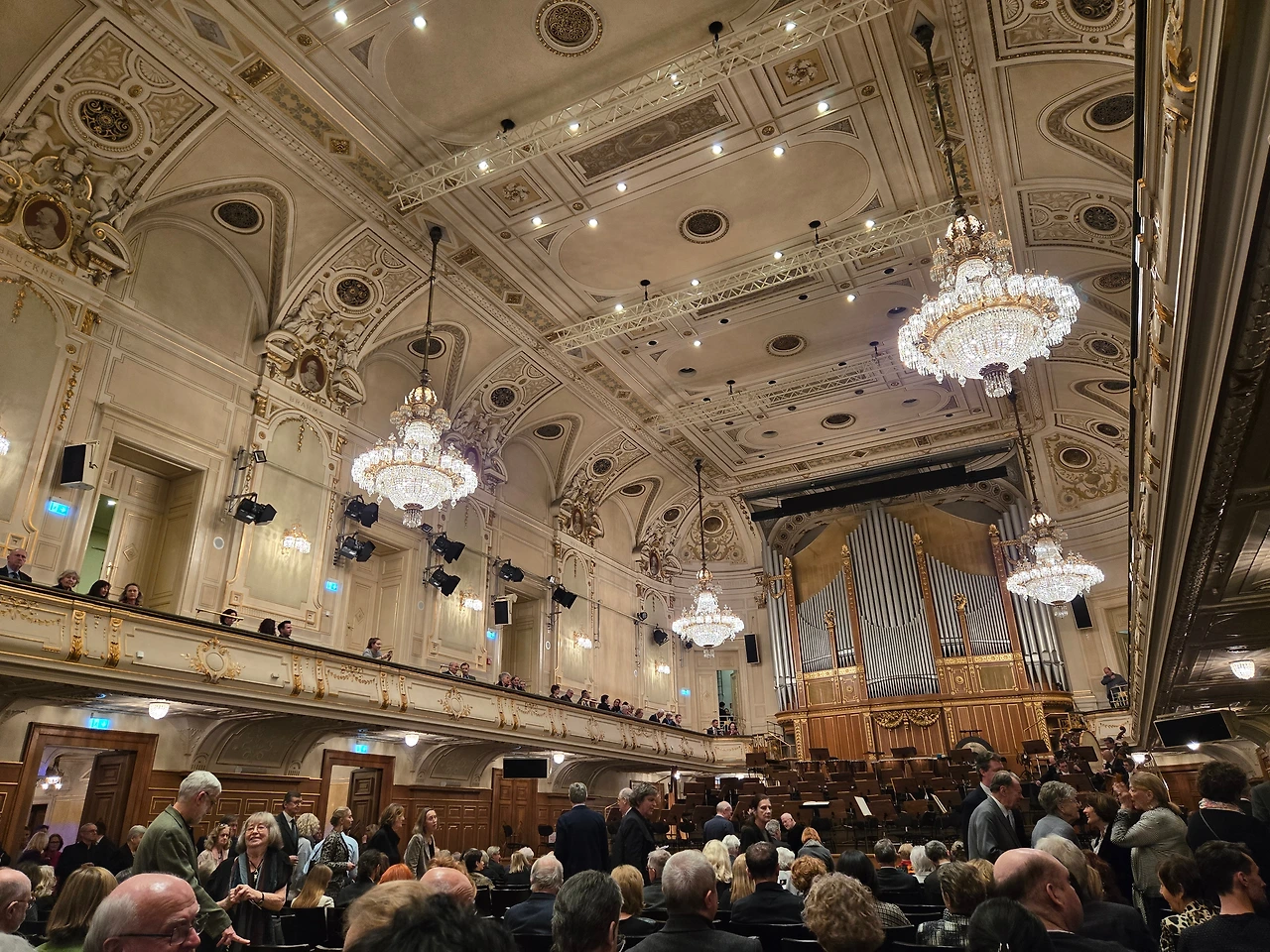 멋진 공연을 선사한 지휘자와 비올리스트. 공연장 내부_유명한 작곡가들의 이름과 초상화가 걸려있다. 인터미션에 모두 한잔씩 하는 모습 이미 좋은 자리는 만석이라 구석에 자리를 잡았다.