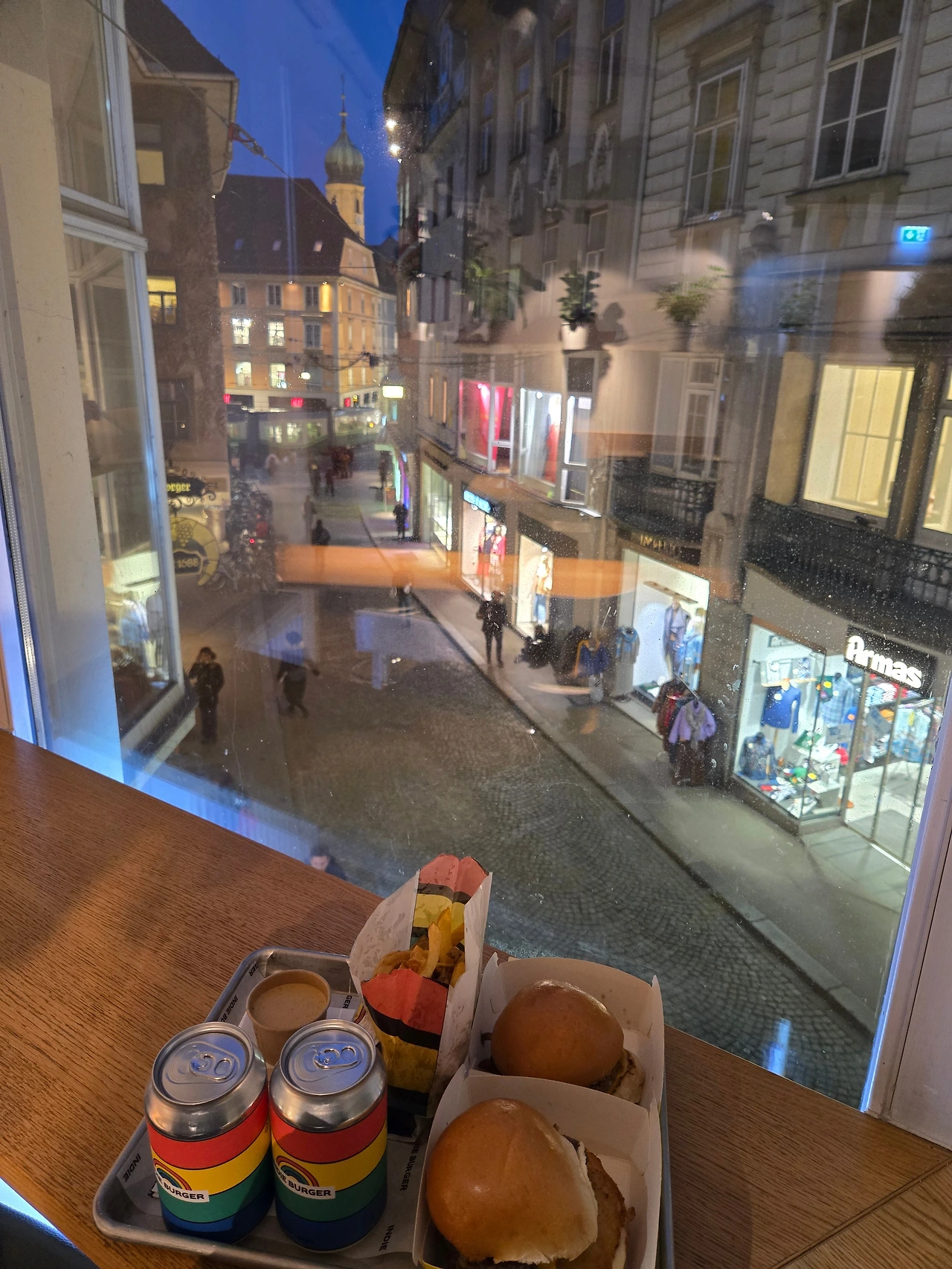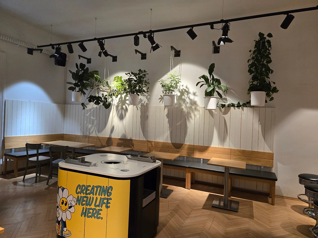 가게의 내부 전경_프랜차이즈 버거집 인테리어 + 플랜테리어가 묘하게 섞였다. 이유는 가게에서 나오는 음식물 쓰레기를 퇴비로 분해해 그것으로 작물을 기른다는 친환경이 콘셉트이기 때문이다. 우리나라의 많은 가정들이 집집마다 음식물 쓰레기 처리기가 있다는 놀라운 사실을 얘기해 줬다. 기본 버거와 새우패티가 들어간 버거, 감자튀김 (시그니처소스 추가), 귀엽게 포장한 일반 맥주. 맛은 건강한 맛이었다. (맛은 나쁠 게 없으나 사악한 가격으로 앞으론 오스트리아에서 버거는 해 먹으려 한다.)