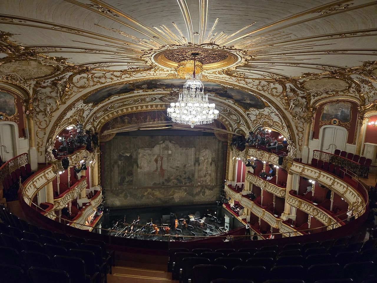 그라츠 오페라 극장 내부 전경을 담기 위해 제일 위층에 올라와 사진을 찍었다. 1층 좌석에서는 오케스트라가 보이지 않는다. 오페라 극장 외부의 모습 전쟁 전에는 더 화려한 모습이었다고 한다.