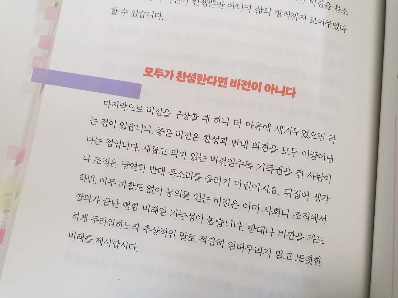 '모두가 찬성한다면 비전이 아니다.'라는 문장은 <컨셉수업>에서 마주한 그 어떤 문장보다 강력했다. 현실적으로 모두가 오케이 하는 비전은 있을 수 없다. 설사 그렇다 해도 그건 아마 너무 뻔한 소리라서 모두가 동의할 확률이 높다.