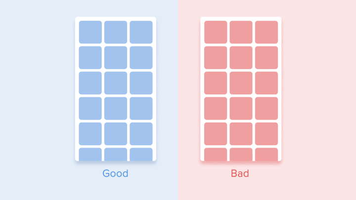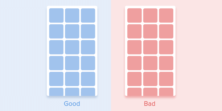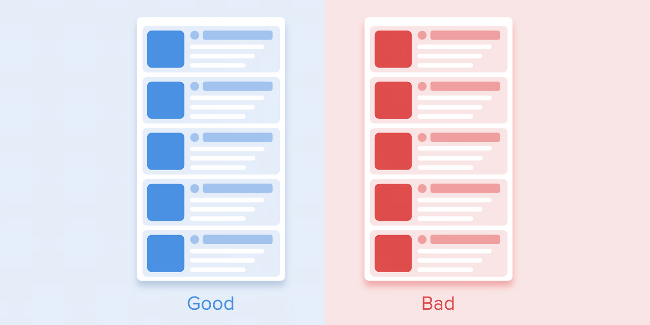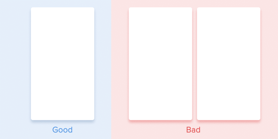 이 경우 모든 카드들의 등장은 위에서 아래로 사용자의 주의를 같은 방향으로 이끄는 하나의 흐름처럼 인식됩니다. 이렇게 하지 않으면 사용자의 주의가 흐트러지고 한 순간에 모든 요소의 등장이 나쁘게 보여집니다.