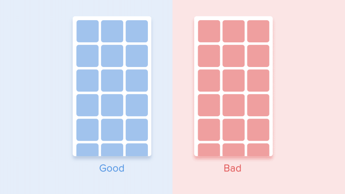 표를 보여줘야할 때는 더 복잡해집니다. 이 때는 사용자의 초점이 대각선으로 향하기 때문에 요소들을 하나씩 표현하는 것은 좋지 않습니다. 각 요소를 하나씩 드러내면 애니메이션이 지나치게 길어지고 사용자의 주의력이 지그재그처럼 변하게 됩니다.