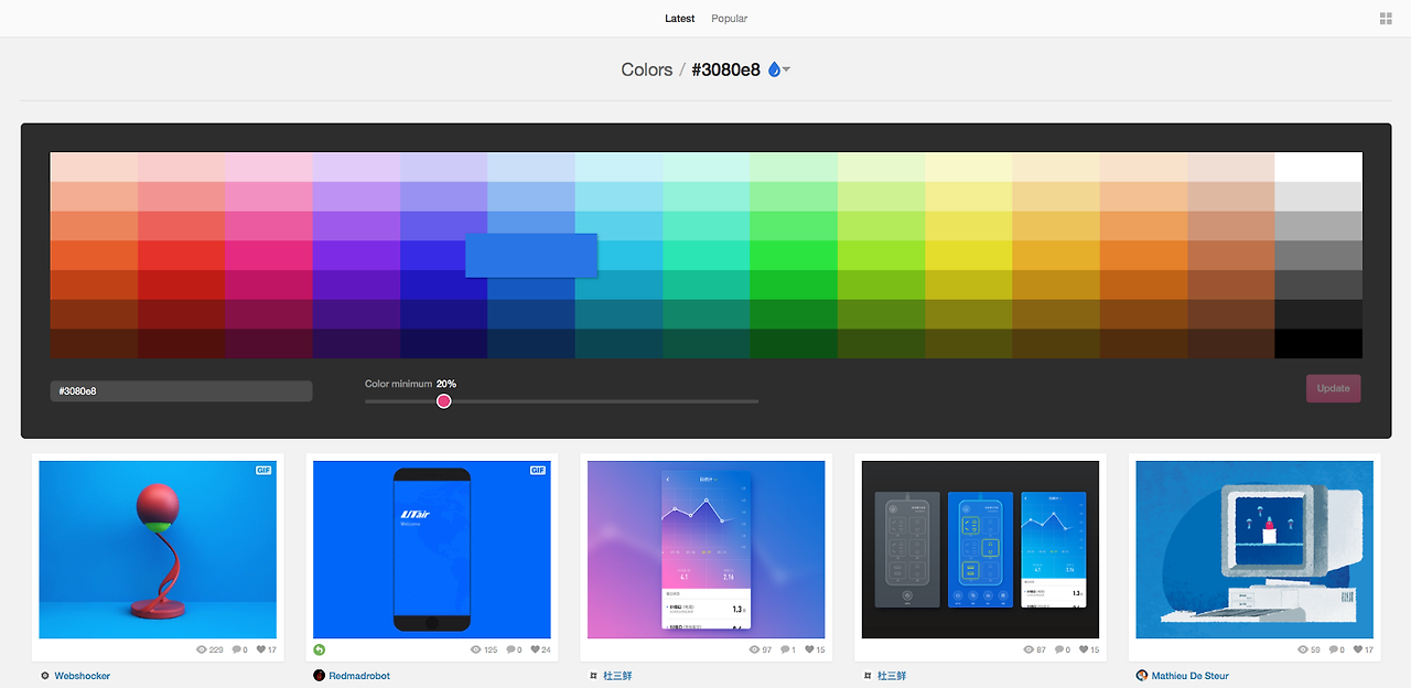 우리가 UI 레퍼런스에 대해 이야기를 나눈다면 dribbble은 최고의 공간입니다. 이곳에는 컬러로 검색할 수 있는 툴이 마련되어 있습니다. 그러므로 다른 디자이너들이 특정컬러를 어떻게 사용했는지 시각적인 조사가 필요하다면 이 곳을 방문하면 됩니다. - dribbble.com/colors