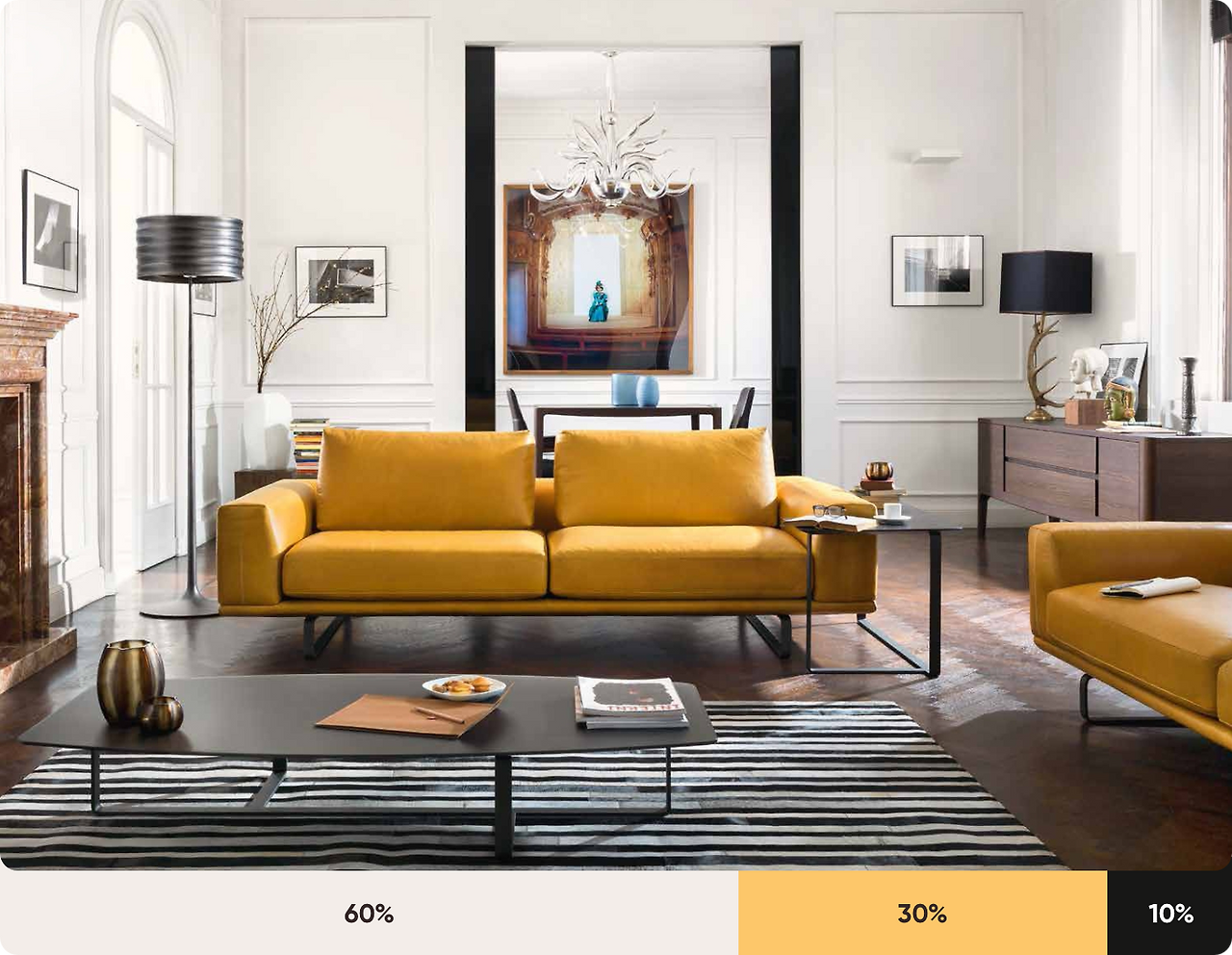 이 인테리어 디자인 규칙은 당신이 색상표를 쉽게 구성할 수 있도록 도와주는 전통적인 장식기법입니다. 60% + 30% + 10% 비율은 컬러의 균형을 의미합니다. 이러한 공식은 균형감각을 길러주고 눈이 하나의 초점에서 다음 초점으로 편하게 넘어갈 수 있도록 해줍니다. 그리고 활용하기에도 굉장히 간단합니다.