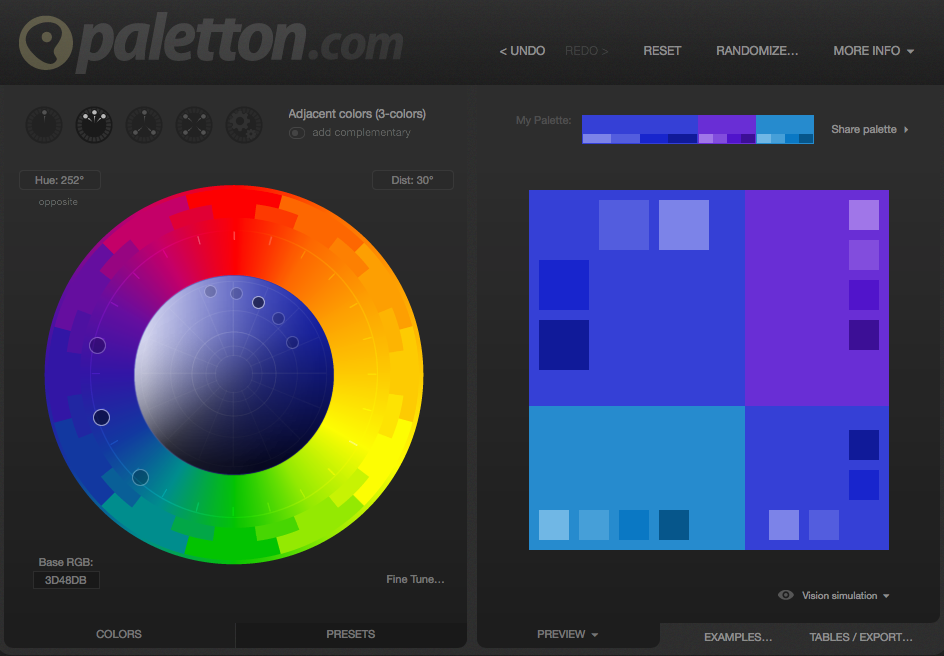 이 툴은 Kuler와 유사하지만, 차이가 있다면 5가지 톤으로 제한되어 있다는 점입니다. 이미 결정된 주요컬러에 다른 톤들을 추가해서 보고싶을 때 사용하기 좋은 툴입니다.