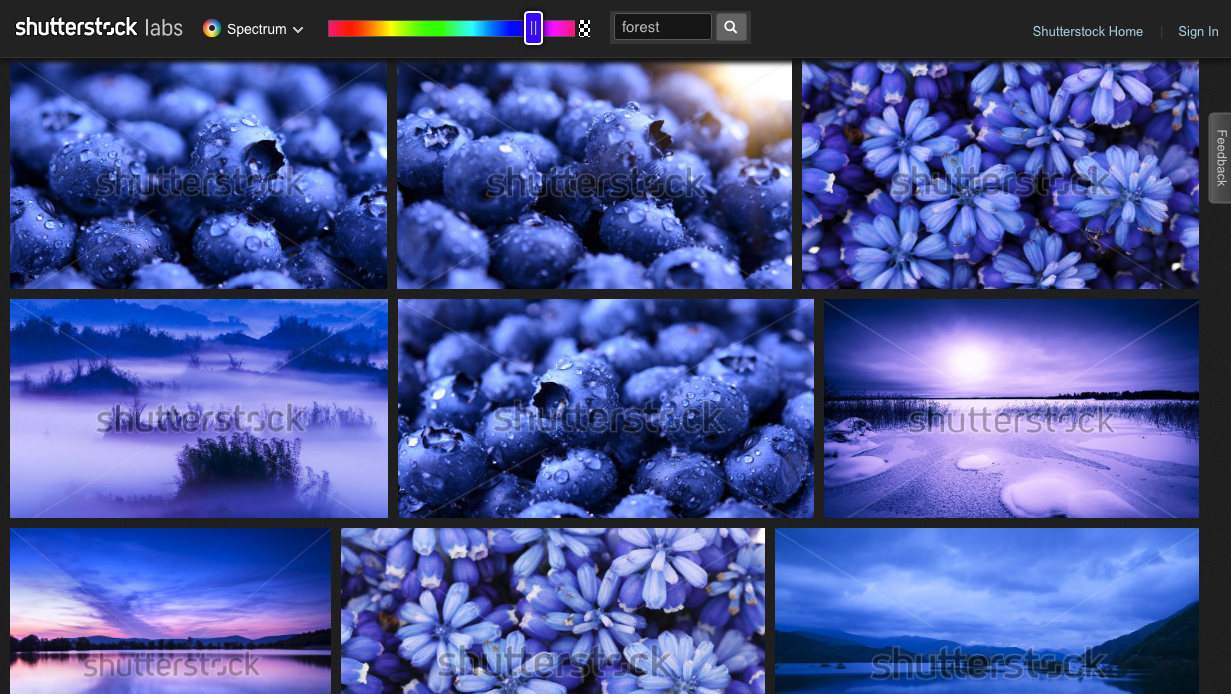 직접 고른 컬러로 이미지 검색을 하고 싶다면 어떻게 해야합니까?라고 묻는다면, 특정 톤으로부터 이미지들을 찾을 수 있는 Shutterstock의 ‘Spectrum’이라는 툴이 있습니다. 워터마크가 있긴하지만 팔레트를 만들기에 충분한 미리보기 이미지를 제공하기 때문에 굳이 구독료까지 낼 필요는 없습니다.