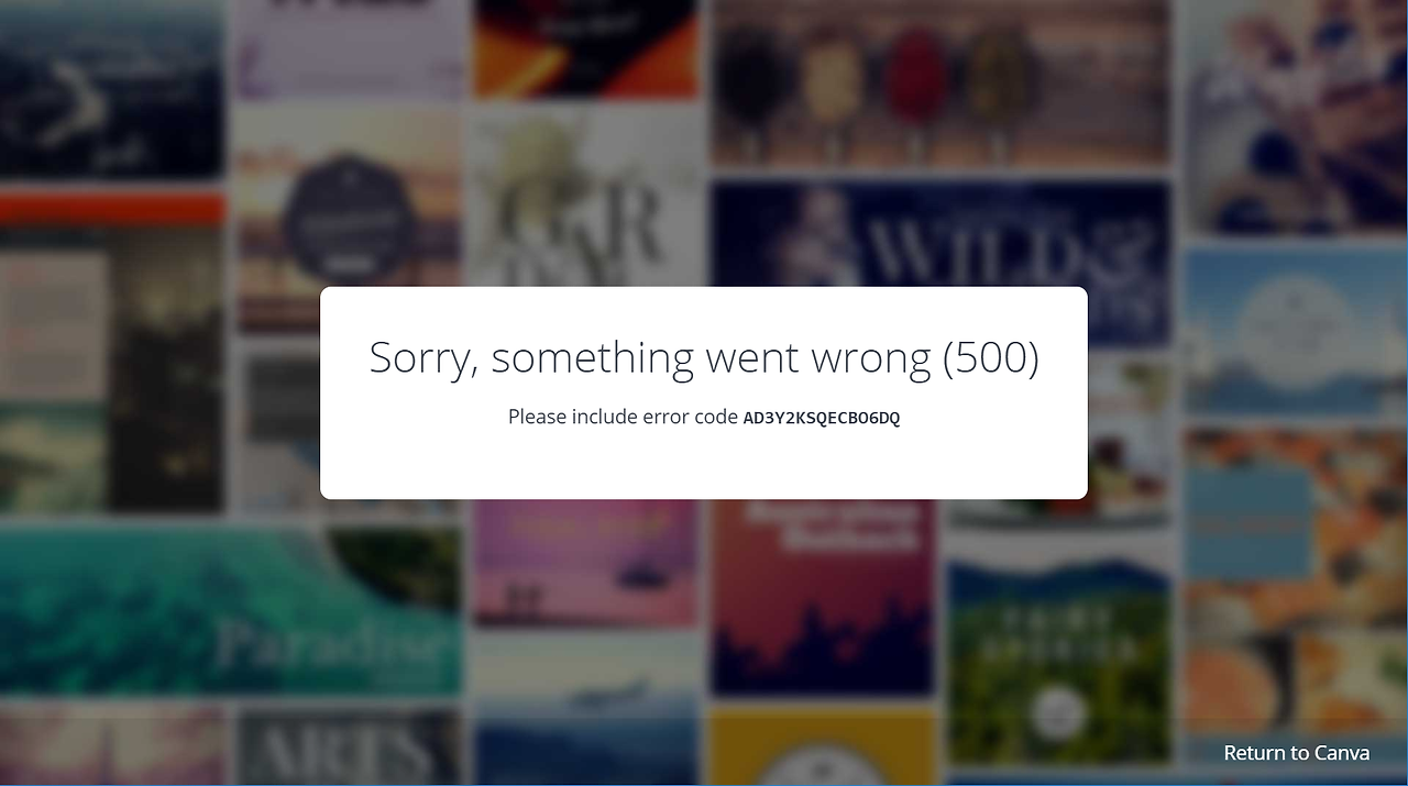 Canva의 에러페이지는 블러처리된 배경이미지 위에 다이얼로그창 에러메세지를 보여줍니다.