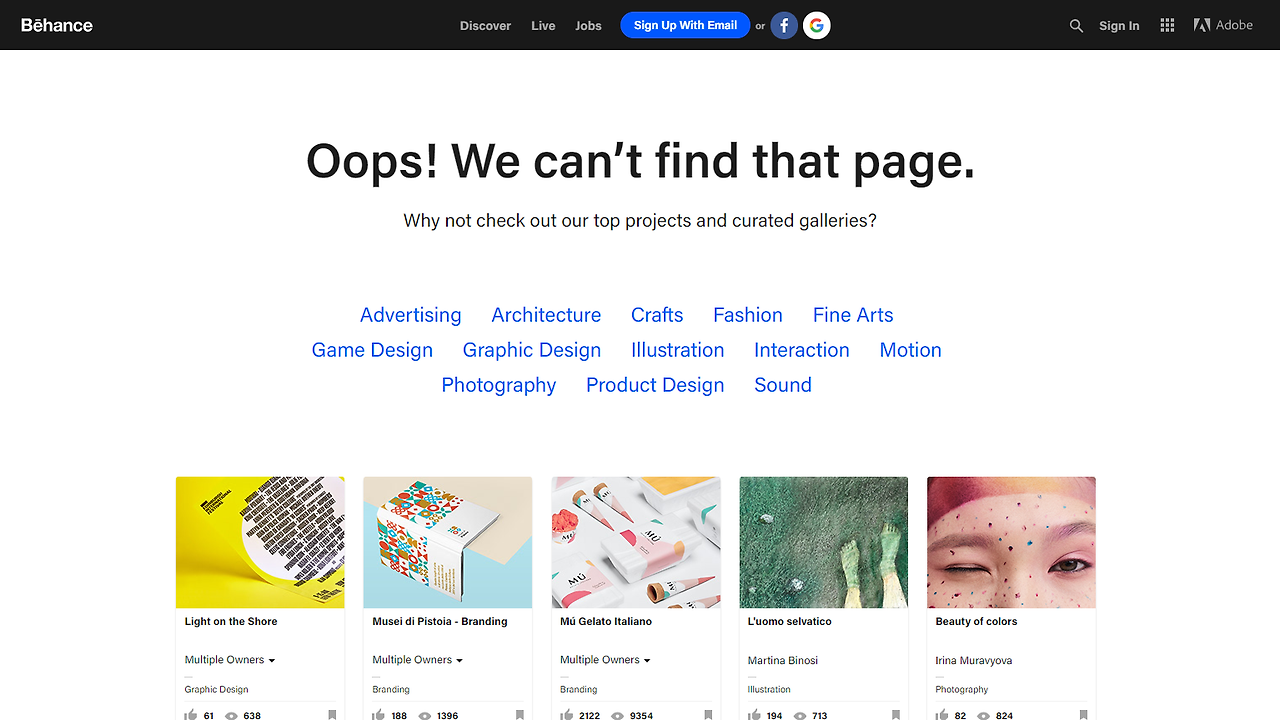 Behance의 에러페이지는 페이지 중앙에 에러메세지가 있는 다른 사이트들과 같습니다.