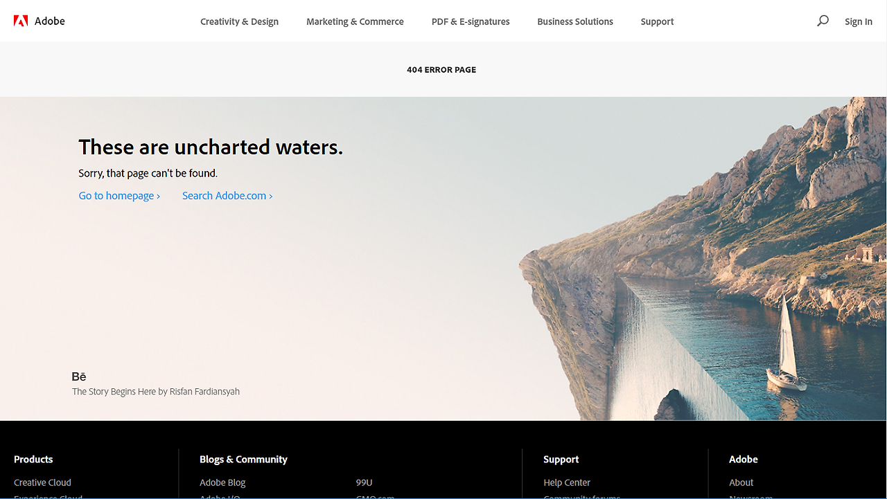 어도비의 에러페이지는 오른쪽에 큰 시각이미지를 두고 가운데에 짧은 메세지를 전하여 기분 좋아지는 룩을 제공합니다.