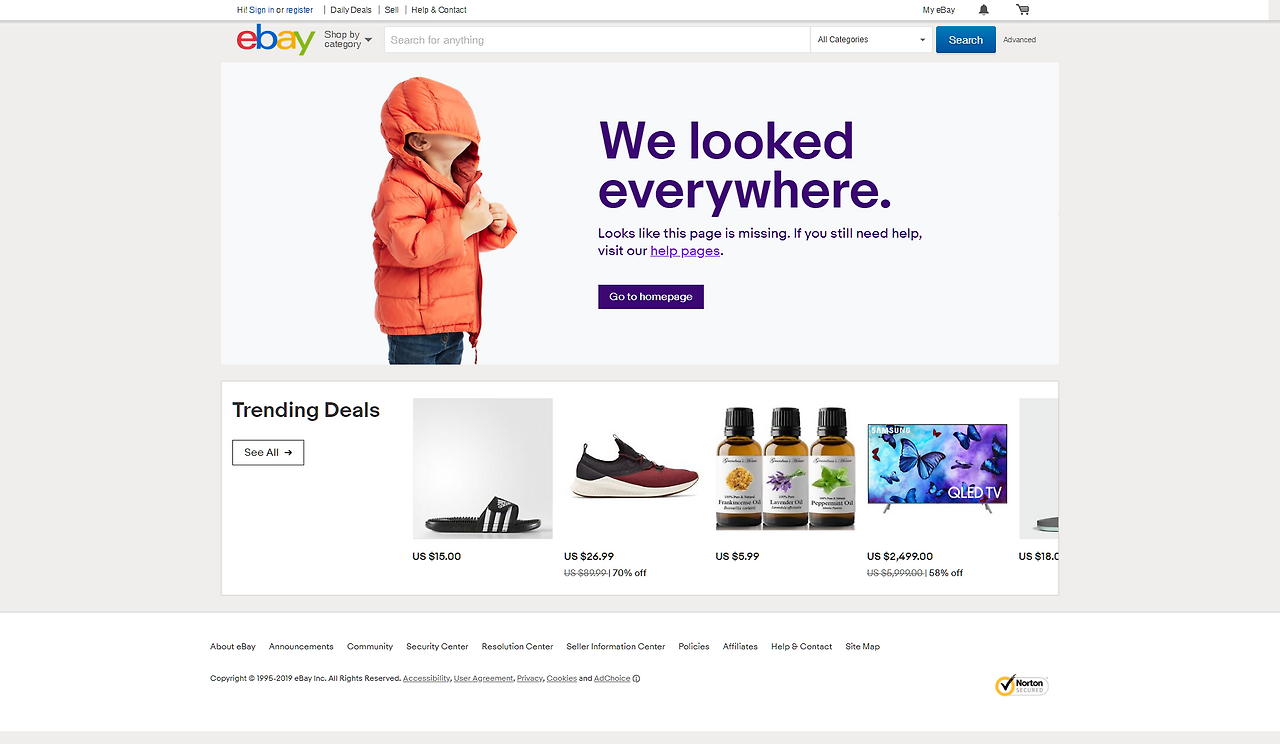 eBay에서 그 사이에 에러페이지를 리뉴얼 했더군요. After의 모습은 제가 따로 추가합니다! 바뀐 모습을 보니 모자를 뒤집어쓴 어린아이 모습을 통해 오류를 더 재미있게 전달하고 있습니다. 그리고 아래에 추천컨텐츠도 추가되었습니다. 기존의 오류 페이지보다 훨씬 사용자 친화적으로 변화한 룩입니다!