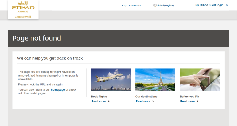 Etihad Airways 에러페이지는 다른 평범한 에러페이지들과 같이 사이트의 다른 페이지로 넘어가는 링크를 제공합니다.