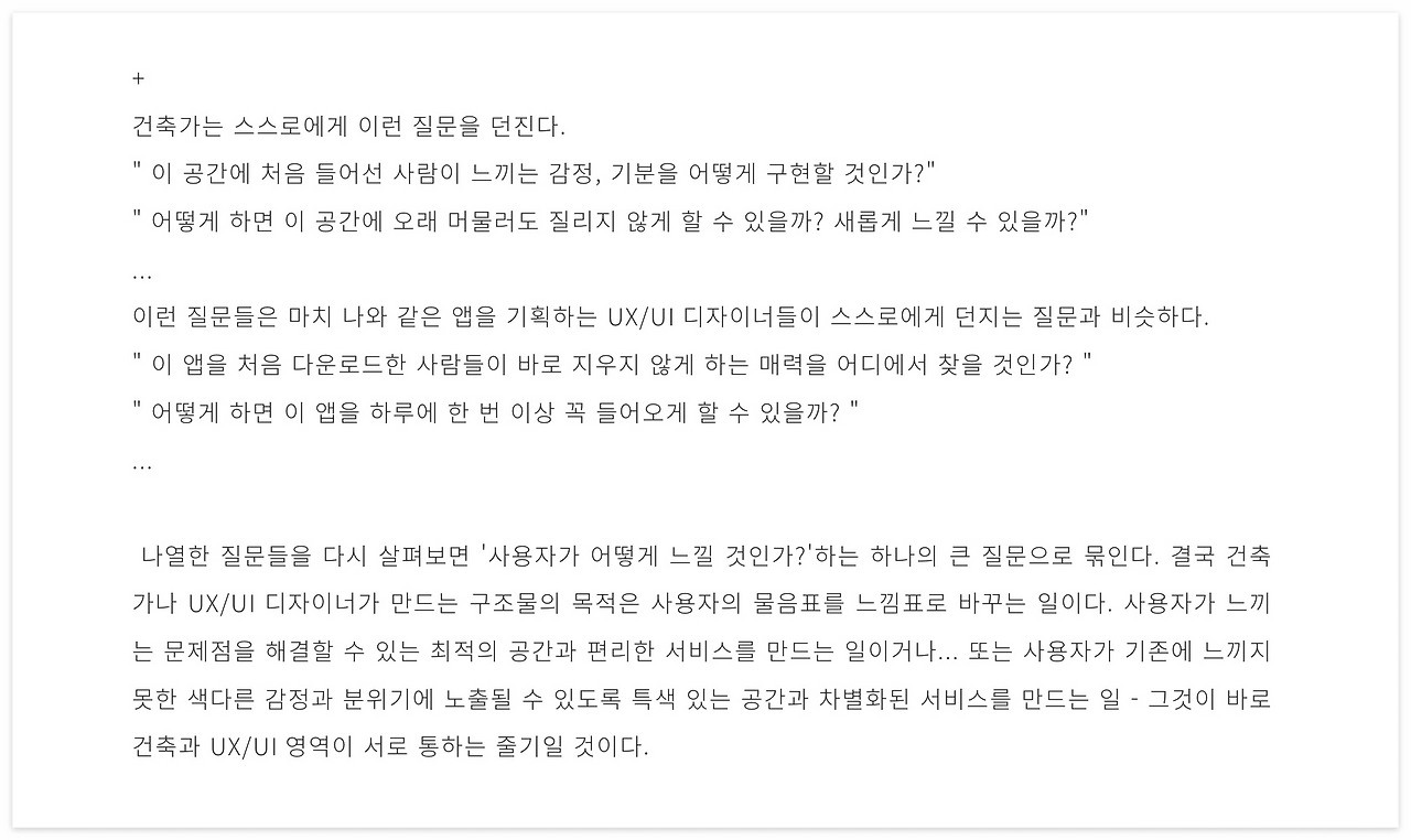 그리고 너무 신기하게도 내가 브런치에 처음 썼던 '건축과 UX/UI 유사점'을 다룬 글이랑 너무 닮은 부분이 있었는데, 읽다 보니 작가님을 더 만나고 싶어졌다. 결국 나도 작가님도 말하고 싶은 메세지는 이거다. 어떤 사업이든 서비스든 결국 사용자한테 덫을 던지고 한번 들어오면 못 나가는 이유가 최대한 많을수록 매력적인 비즈니스가 된다는 것! 내 글과 이 책에 있었던 두 질문과 문장 하나씩을 아래에 남겨뒀다.