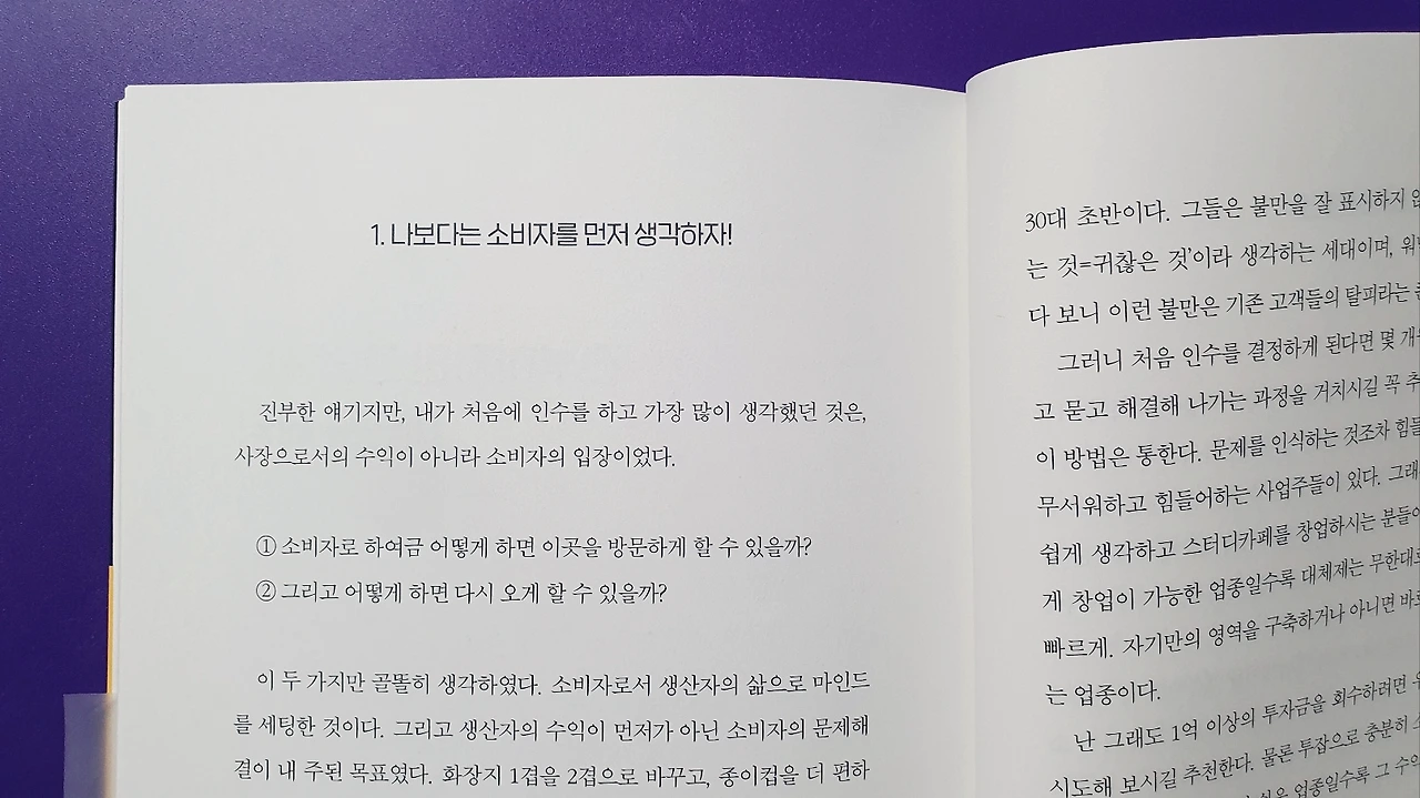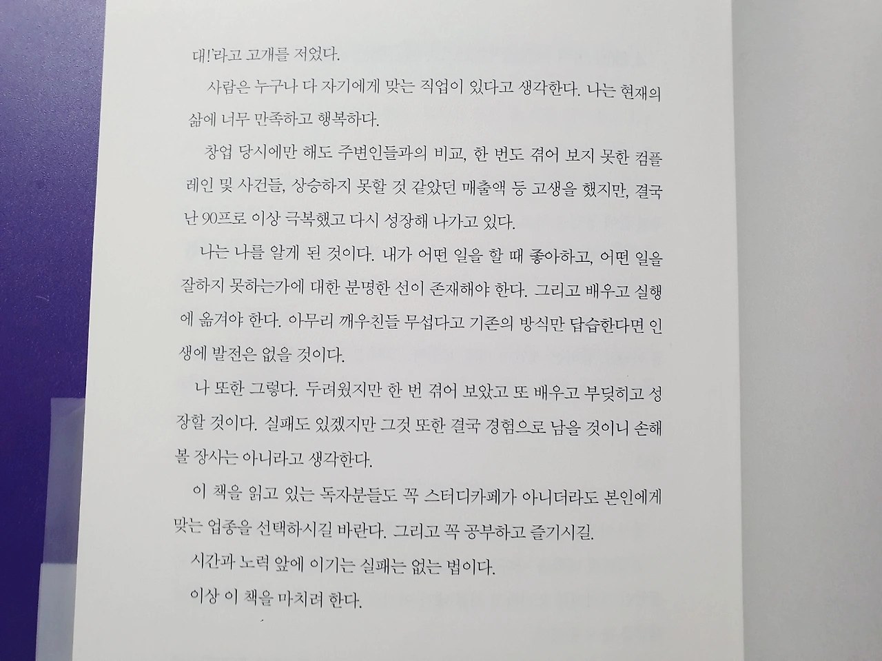 단순히 '스터디카페 운영'만을 이야기하고 싶었다면, 이런 제목이 아니었을 것. 작가님은 분명 공간사업만 이야기하고 싶은 게 아니라 본인의 선택과 선택을 책임지는 과정을 담고 싶었을 것이다. 그리고 그 과정에서 얻은 시행착오와 노하우를 나누려고 한 게 아닐까? 사람들에게 가치 있는 영향력을 주고 싶었을테니까!