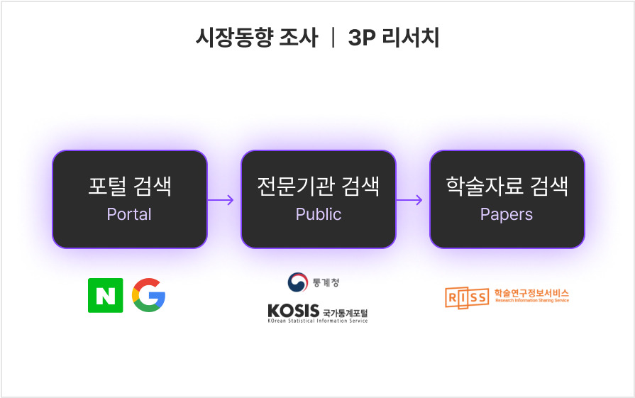 이 때 사용되는 프레임워크는 '3P 리서치'이다. 검색도구이자 대상인 Portal(포털), Public(전문기관), Papers(학술자료) 세 가지를 모두 아우르는 말이며, 쉽게 이해하고 기억할 수 있도록 직접 이름을 붙여보았다. 각각의 검색 방법과 시간을 아낄 수 있는 유용한 사이트 정보는 다음 글에서 더 자세히 다룰 예정이다.