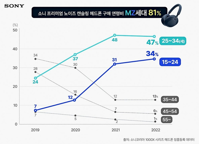그리고 소니의 헤드셋 구매 데이터를 보니 10대부터 30대까지 주로 MZ세대가 소비층을 이루는 것으로 보인다. 이들 중, 트렌디한 아이템이라는 이유로 흐름에 올라탄사람도 많을 것이다. 실제로 최근 MZ세대, 잘파세대 사이에 2000년대 서양 하이틴 스타들 감성이 묻어나는 'Y2K' 스타일이 유행하고 있는데, 헤드폰이 필수아이템 반열에 오르면서 기존 헤드셋 주요 고객층인 3040 수요를 1020세대가 무섭게 따라잡았다.