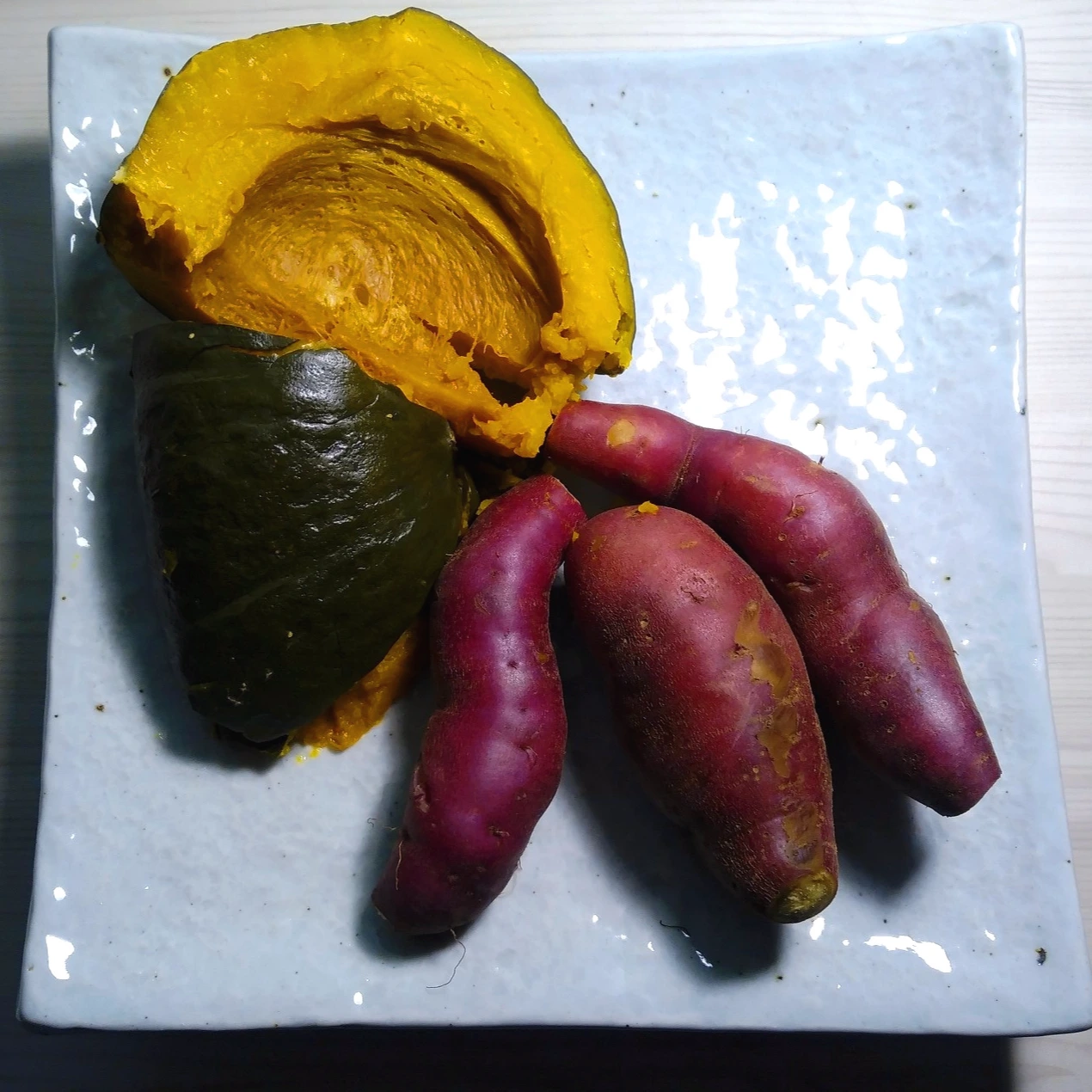 오늘 아침 메뉴, 찐 단호박과 고구마. 아직 사 오지 않은 우유 한 잔.
