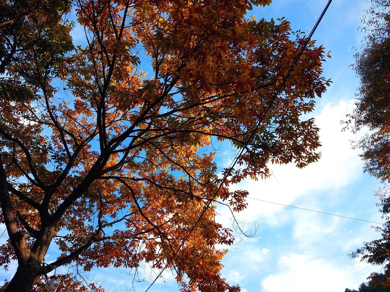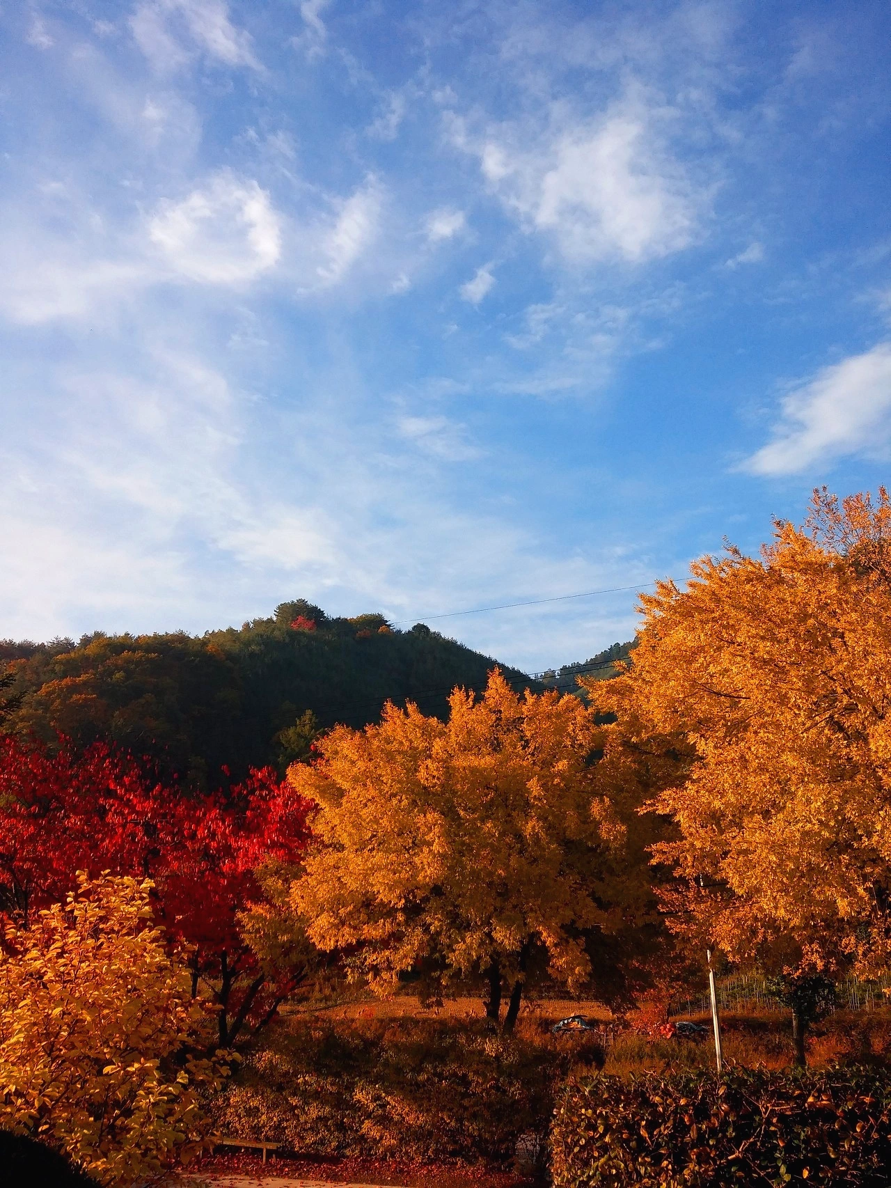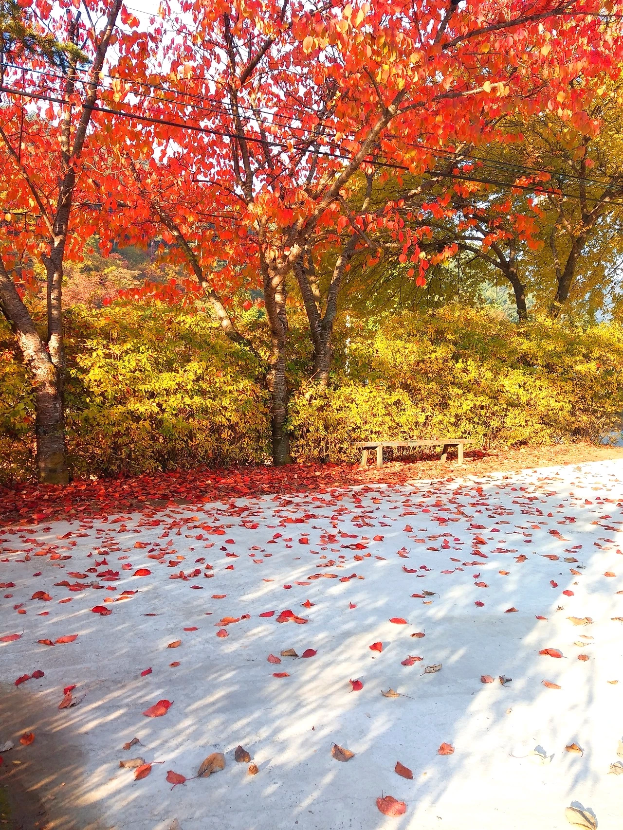 관심을 귀에서 눈으로 옮겨 한 바퀴 빙 둘러보면 눈 가는 곳마다 호강이다. 제 각기 다른 초록이었기는 해도 모두 초록이었던 나뭇잎들이 노랑과 빨강으로 나누어지고 그 노랑 안에서도, 그 빨강 안에서도 또 나누어지는 색깔파티. 거기에 파란색 하늘이 배경이 되어주니 어디서든 자기 색을 더 분명히 드러낸다. 어떤 나무도 같은 색은 없다. 같은 은행나무라도 어느 나무는 더 노랗고 어느 나무는 아직 위쪽만 노랗다. 서 있는 자리가 어딘지, 이웃이 누군지에 따라서 같은 종이라도 모두 다른 색이다. 모두가 하얗게 덮여버리기 전, 가을은 이렇게 모두 자기 자신이 되는 계절일까.