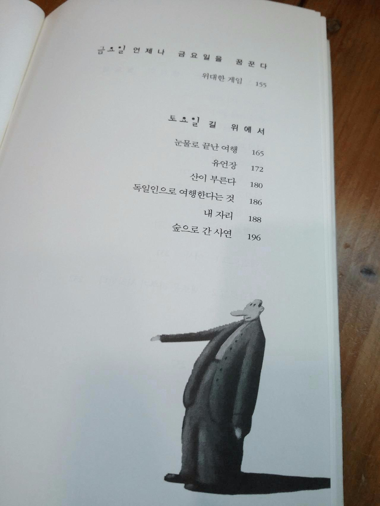 이 책의 매력은 낭독을 위한 글이라는 데서 시작하는지도 모른다. 무슨 말이냐면, 일단 지루하지 않다. 그리고 책의 등장인물은 작가의 이름과 같이 호어스트인데 이 인물이 또 헤어 나올 수 없이 매력적이다. 이야기들은 각각의 개별적인 작품이고 구성은 시간순이 아니다. 책의 구성은 작가도 모르는 사이에 생긴 내재적 질서 같은 것이 존재했고 그 내재적 질서에 따라 목차를 구성했다. 내재적 질서 어쩌고 하니까 뭔가 심오해 보이지만, 어려운 이야기가 전혀 아니라는 것을 읽어보면 알 수 있다. 작가가 말하는 주제가 있다면 이것이다. 작가는 이 이야기를 하나로 뭉뚱그려보면 하나의 그림이 떠오른다고 한다. 그것은, 세상은 언제나 금요일이 아니라는 것이다. 이 말이 무슨 말인지도 읽어보면 알 수 있다. 사실은 처음 읽었을 때는 제목이 말하는 바가 정확히 무엇인지 알 수 없었다. 처음 읽었을 때 나는 겨우 이십 대 초반이었기 때문이다. 그리고 십여 년이 지나 삼십 대 초반이 되고 보니 제목이 말하는 바가 무엇인지 조금은 더 이해가 된다. 십 년쯤 더 지나 사십 대가 되면 또 다른 느낌으로 읽을 수 있을 것 같아서 나는 이 책을 절대 잃어버리지 않을 작정이다.