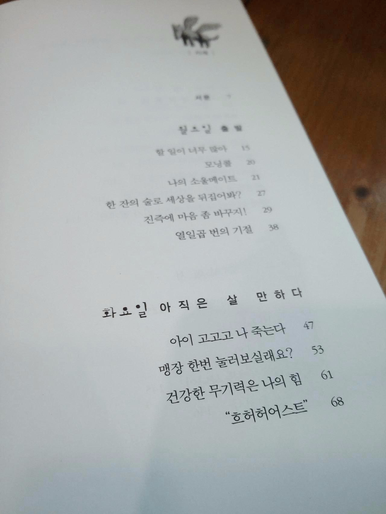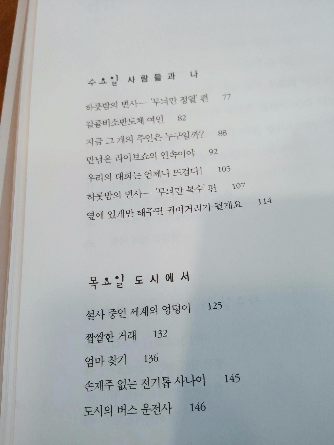 이 책은 내 가장 친한 친구이자 오랜 친구인 남동생이 그가 고등학교 시절에 추천해준 책이다. 그러니까 지금으로부터 십여 년 전의 일이다. 그 후부터 나는 오늘까지도 이 책을 사랑하고 아끼며 내 책장의 가장 한 가운데, 손이 잘 가고 언제나 눈이 닿는 곳에 꽂아 놓고 있다. 그리고 때때로 마음이 너무 분주하고 사는 게 팍팍하다는 생각이 들 때마다 꺼내 본다. 당 떨어졌을 때 초콜릿 먹듯이 말이다. 이 책은 당 보충용으로도 좋고, 선물용으로도 좋다. 선물용 누군가에게 책 선물을 해 본 사람은 알겠지만, 책 선물이라는 게 생각보다 참 쉽지 않은 일다. 그 사람이 소설을 좋아하는지, 수필을 좋아하는지 알 수 없고 심지어 그 사람이 책을 좋아하는지 아닌지도 알 수 없다면 이 책이 딱이다. 이 책은 소설 같으면서도 수필 같다. 게다가 짧다. 어려운 문장도 없고 긴 챕터도 없다. 짧으면 한 페이지, 길어야 다섯 페이지의 짧은 이야기들이 월화수목금토일이라는 익숙한 분류로 모여 있다. 그리고 아주 대중적으로 알려진 작가도 책도 아니어서 선물하면서 책 많이 읽는 척을 하기도 좋다.(아, 이건 말하지 말걸 그랬나)