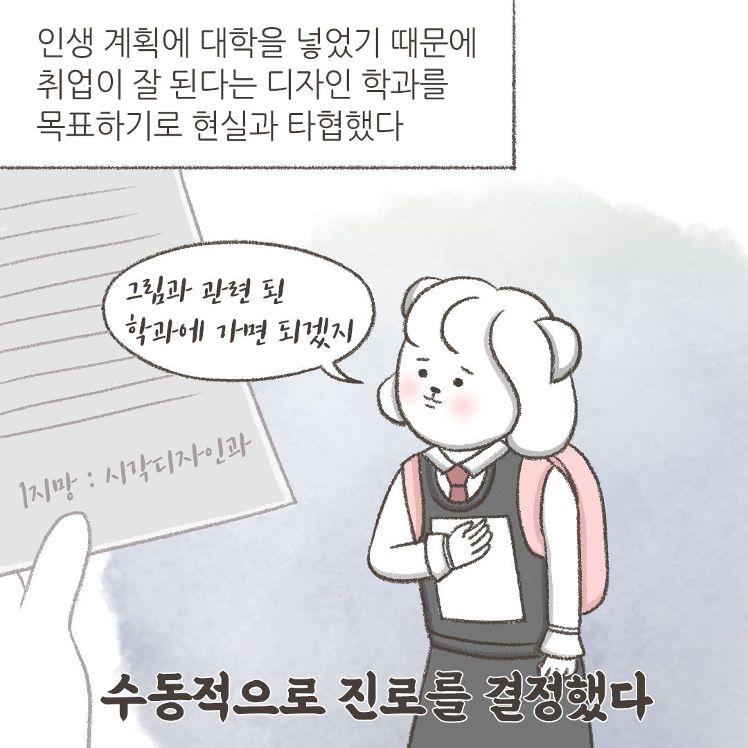 그런데 어느 날 평소와 다름없이 밤샘 과제를 하다 문득 이런 생각이 들더라고요. '이 전공을 평생 해야 하다니. 하기 싫다' '사실 너 학과점수에 목매다는 거잖아. 열심히 살아가고 있다는 걸 보여주기 위해'
