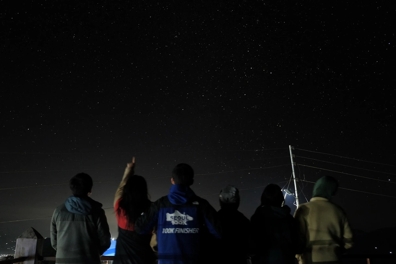 고라니 울음소리와 함께 도란도란 어둠을 헤쳐 올라가다 보니 어느새 키 높은 나무는 사라지고, 억새 가득한 언덕이 보인다. 그리고 가려져 잘 보이지 않았던 밤하늘이 반짝거리고 있었다.