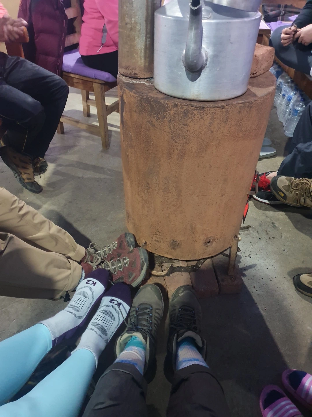 넷째. 주전자에 눈을 가득 퍼 녹인다. 뜨거워 이제 끓기 시작하는 눈을 각자 가져온 물병에 담아 미리 펴 둔 침낭 안에 던져 넣어 둔다. 히말라야의 밤은 서울에서보다 길다. 보통 9시면 _사실은 장작이 다 타고나면 불빛도 없고, 하루 종일 걸은 피로감에 본인의 침낭으로 들어가기 마련이다._ 다들 잠자리에 든다. 나무로 만들어진 침대인지 침상인지 모를 것의 위에 산 밑에서 가져온 침낭을 펼치고, 어쩐지 꿉꿉한 냄새가 나는 솜인지 구스인지가 들어있는 이불을 덮고 자곤 했다.