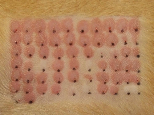 피부병이 심해서 아토피나 음식 알러지가 의심된다면 Serologic allergen specific IgE test 혹은 IDST (intradermal skin test)를 해보는 것이 좋다. IDST는 피부에 항원을 집어넣은 뒤에 Type1 반응의 결과로 나타나는 두드러기 (Urticaria)를 검사한다. 피부를 찔러서 항원을 주입하는 Skin prick test (PST) 검사와 패치를 붙이는 Skin patch test 검사 이렇게 두가지로 나뉜다. 방법은 다르지만 아래와 같은 방식으로 피부에 찔러서 여기에 알러지 반응이 있는지 없는지 확인해보는 방법이다.
