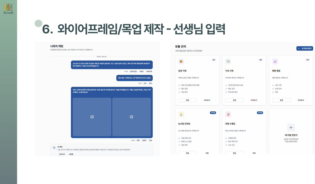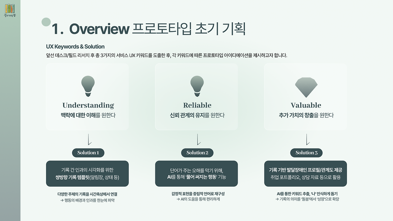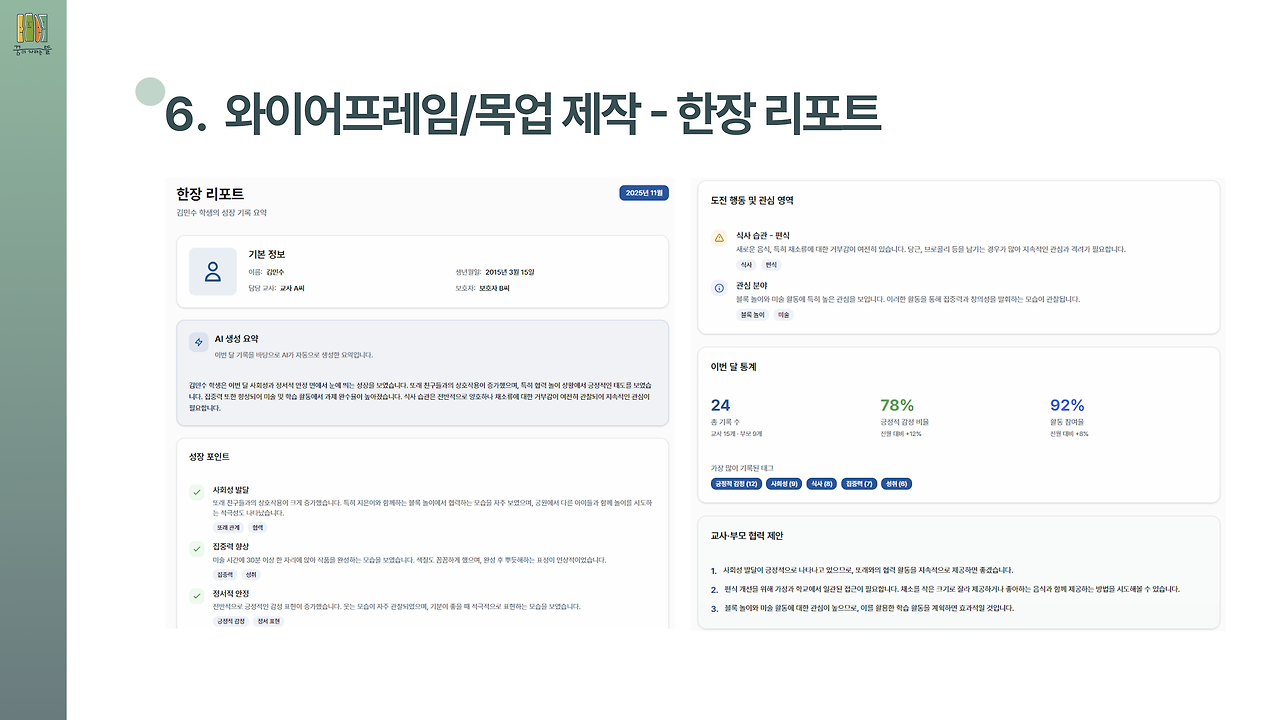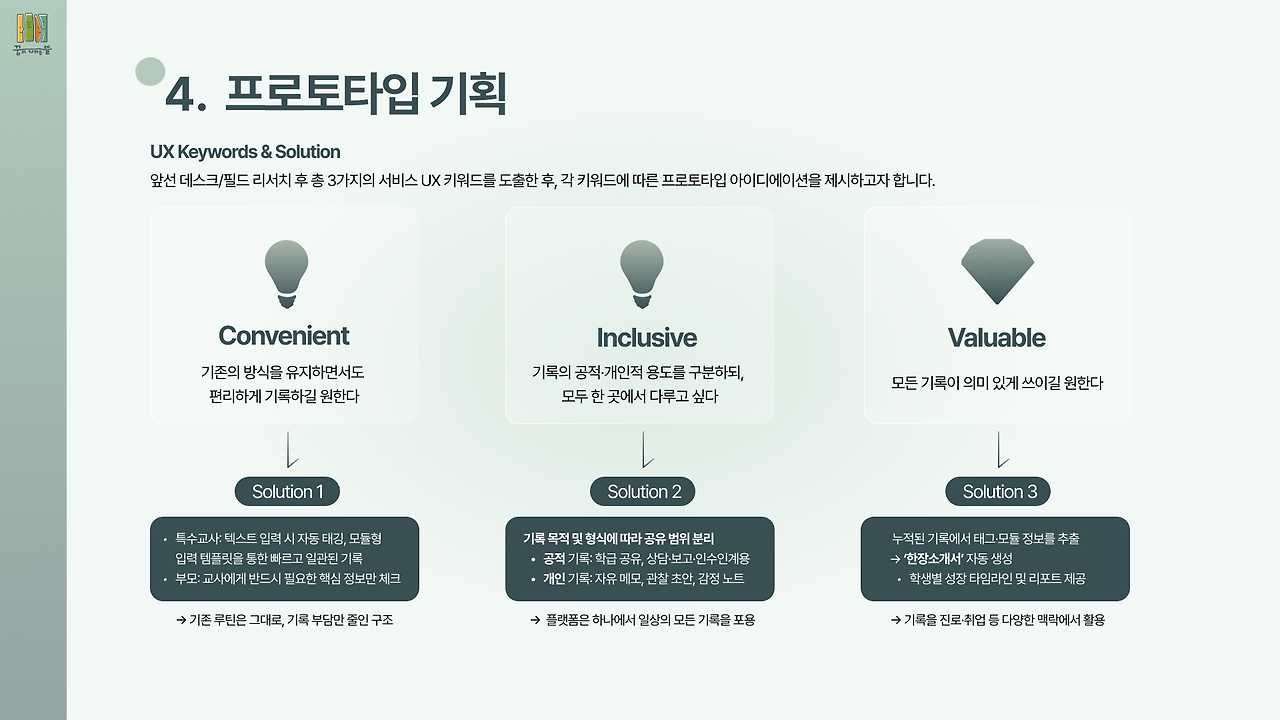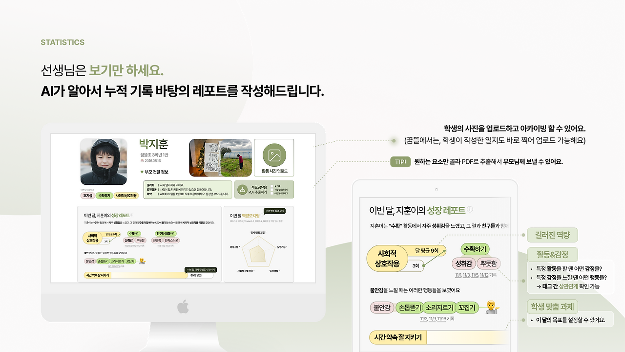 두 가지 기능이 창출할 가치를 가장 잘 나타내는 서비스명이 탄생했습니다. 특수교사가 지나가듯 메모해 둔 성장의 순간이 모이고 분석됨으로써 기록은 자연스럽게 변화를 보여주는 자료가 됩니다.
