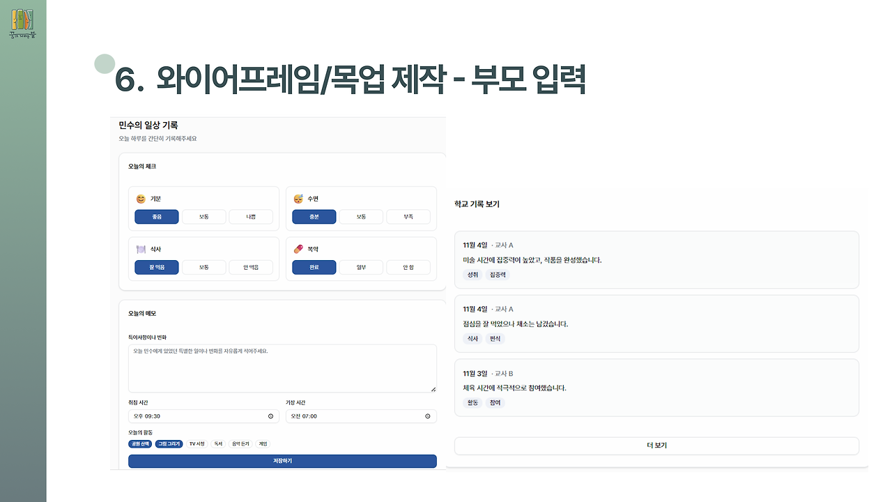 하지만 여전히 양측의 사용자가 작성할 기록 영역도 많고 그렇다 보니 각자의 기록으로부터 확인할 사항이 많습니다. 수정 후에도 인풋에 대한 피드백을 또 받을 수밖에 없었죠. '따지고 보면 교사와 부모가 통화하면 더 쉽게 파악이 되는 게 아니냐?'는 교수님의 날카로운 질문에 멍해져서 고개를 끄덕이던 저희의 허망한 모습이 떠오릅니다.