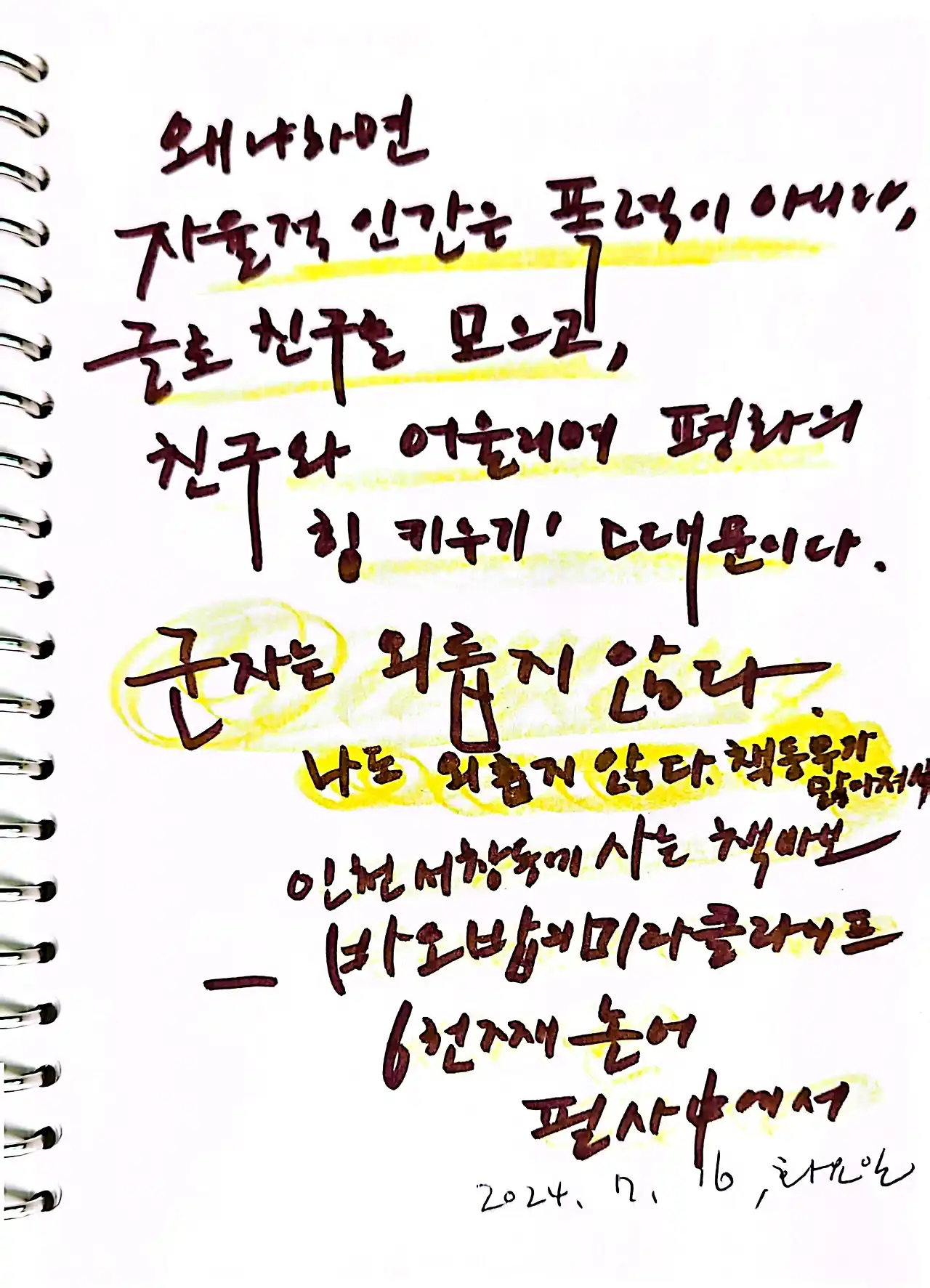 자율적 인간은 폭력이 아니라 글로 친구를 모으고, 친구와 어울리며 평화의 힘을 키우기 때문에 외롭지 않다는 작가의 해석이 마음에 든다.