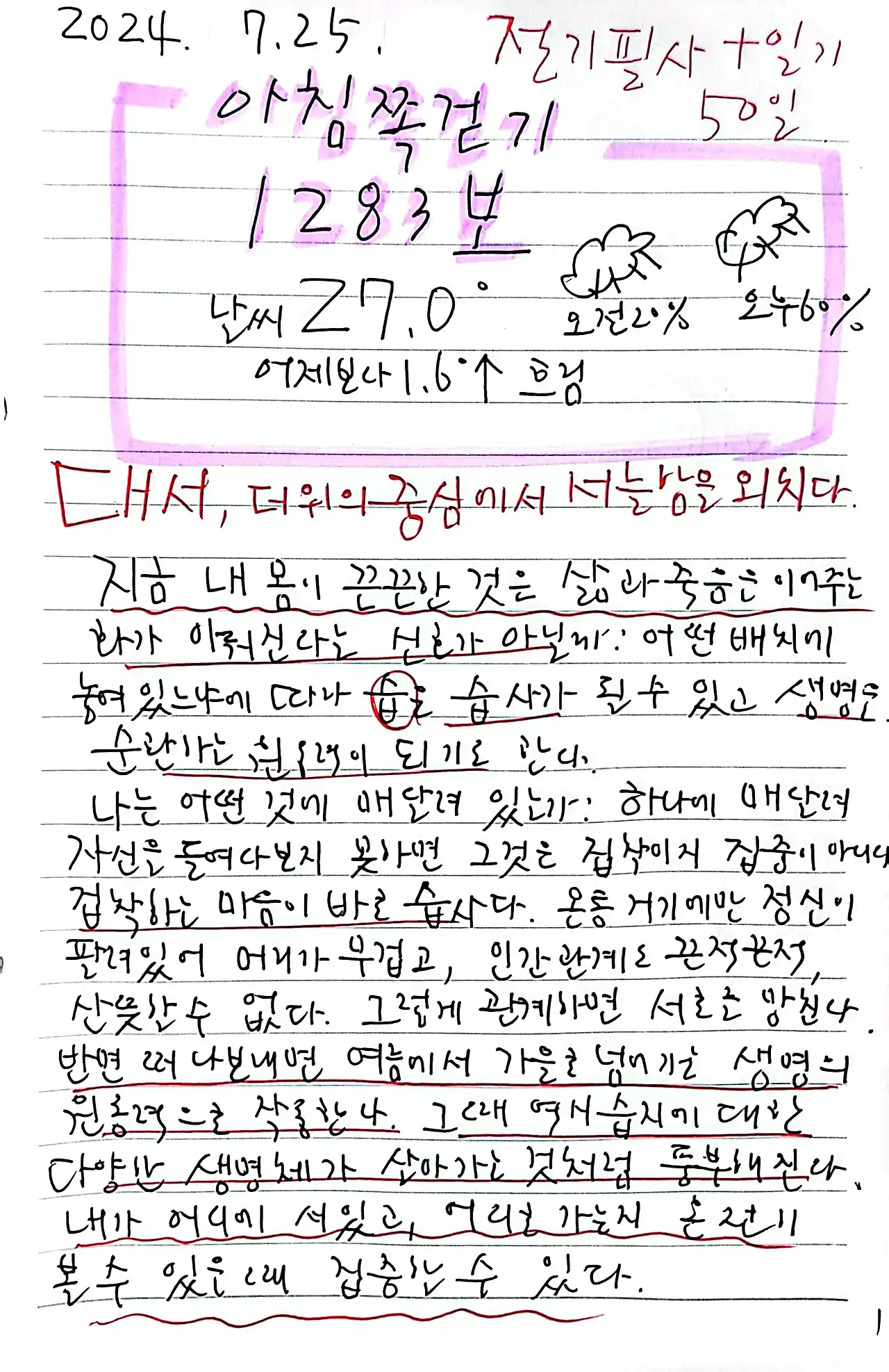 걷고 집으로 돌아와 음양탕을 마시고 바인더와 논어필사 절기일기 쓰기를 아침 루틴으로 마쳤다.