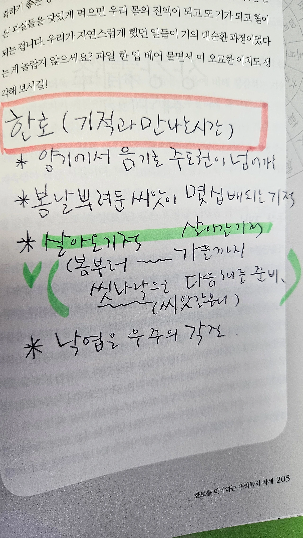 기적을 만나는 시간, 봄날 뿌려둔 씨앗이 몇십 배 되는 기적을 한로에 만나게 된다는 것. 봄부터 가을까지 씻나락으로 다음 해를 준비한다는 글귀가 눈에 들어왔다. 봄부터 씨앗을 뿌려서 잘 살아왔다면 가을엔 몇 배로 불려서 돌아온 기적 같은 씨앗 중에 내년에 씨 뿌릴 종자로 고르는 작업을 하라는 내용이 이었다.