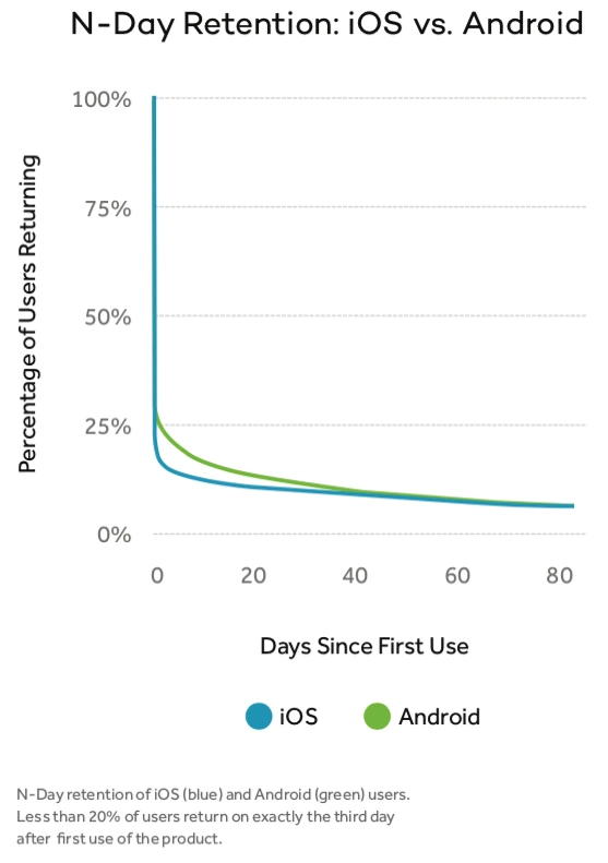 사용자 확보에 충분한 돈을 쏟아부으면 App Store의 상위 차트 중 하나에 일시적으로 진입할 수 있습니다. 하지만 사용자를 끌어들이는 것만으로는 충분하지 않습니다. 5억 개 이상의 모바일 기기를 분석한 결과 보통 앱의 경우 신규 사용자의 80%가 다운로드 후 3일 만에 사용을 중단한다는 걸 알 수 있었습니다.