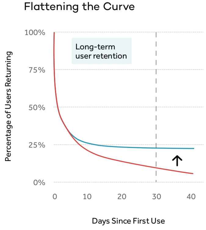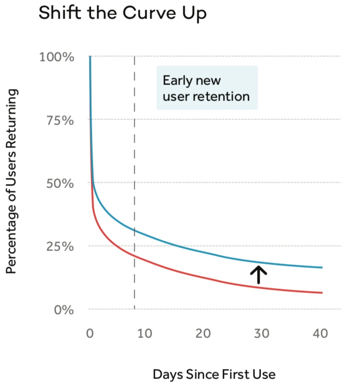 리텐션율을 향상할 수 있는 마법의 공식은 없지만, 이 플레이북은 제품의 리텐션 상태를 진단하고 이를 개선하기 위한 전략을 개발하는 프레임워크를 제공합니다. 리텐션 커브로 돌아가서, Brian Balfour는 리텐션을 개선할 수 있는 두 가지 레버를 설명합니다. 전반적으로 다음과 같은 이점을 제공합니다.
