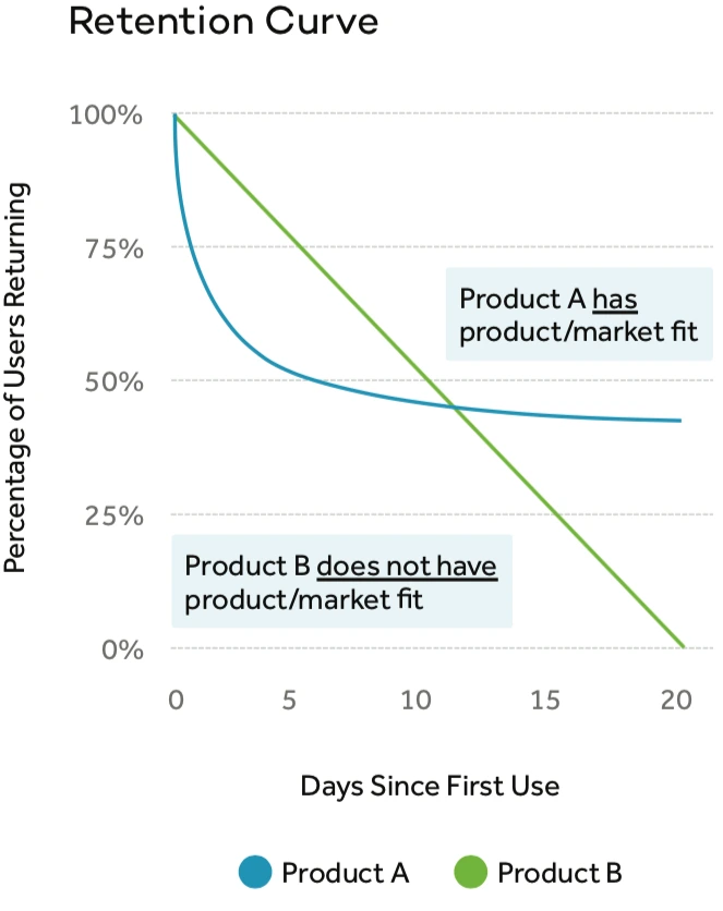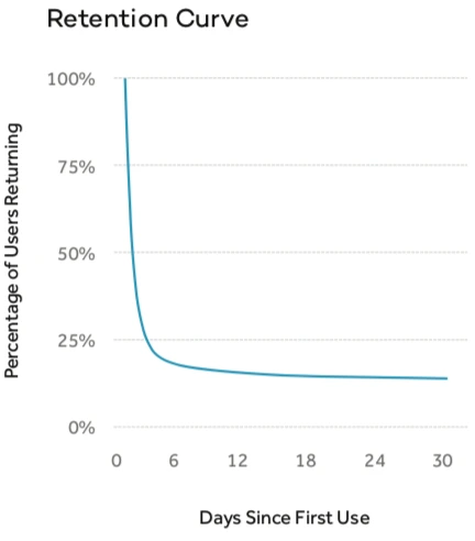 리텐션 수치를 시간에 따른 활성 사용자의 백분율로 표시하고 안정화된 곡선 대신 0에 직선으로 도달하고 있는 경우, 리텐션이 문제가 아니라 제품 시장 적합성 문제를 해결해야 합니다.