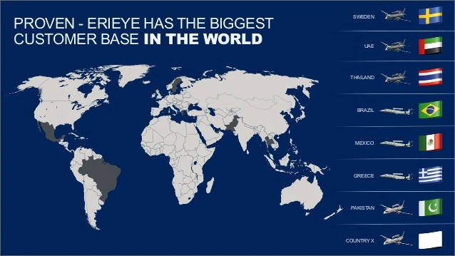 마지막으로, 우리 글로벌아이와 함께 가는 Erieye 체계 탑재 모델들이 현재까지 전세계 다양한 국가와 대륙에서 성공적으로 운용되고 있다는 것이다.