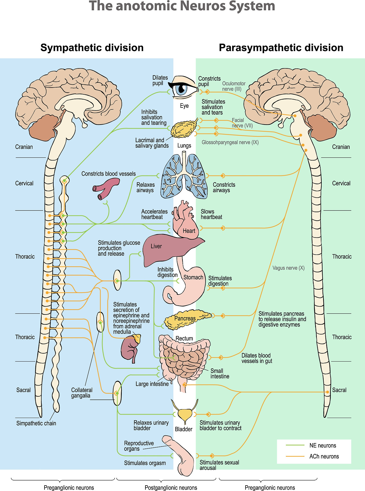 교감신경과 반대되는 개념으로 부교감 신경이 활성화되면 몸은 이완상태가 됩니다. 심박수와 백박을 감소시키죠. 티칭 시험이 끝나고 집에서 편안하게 누워있을 때를 상상해 보세요.