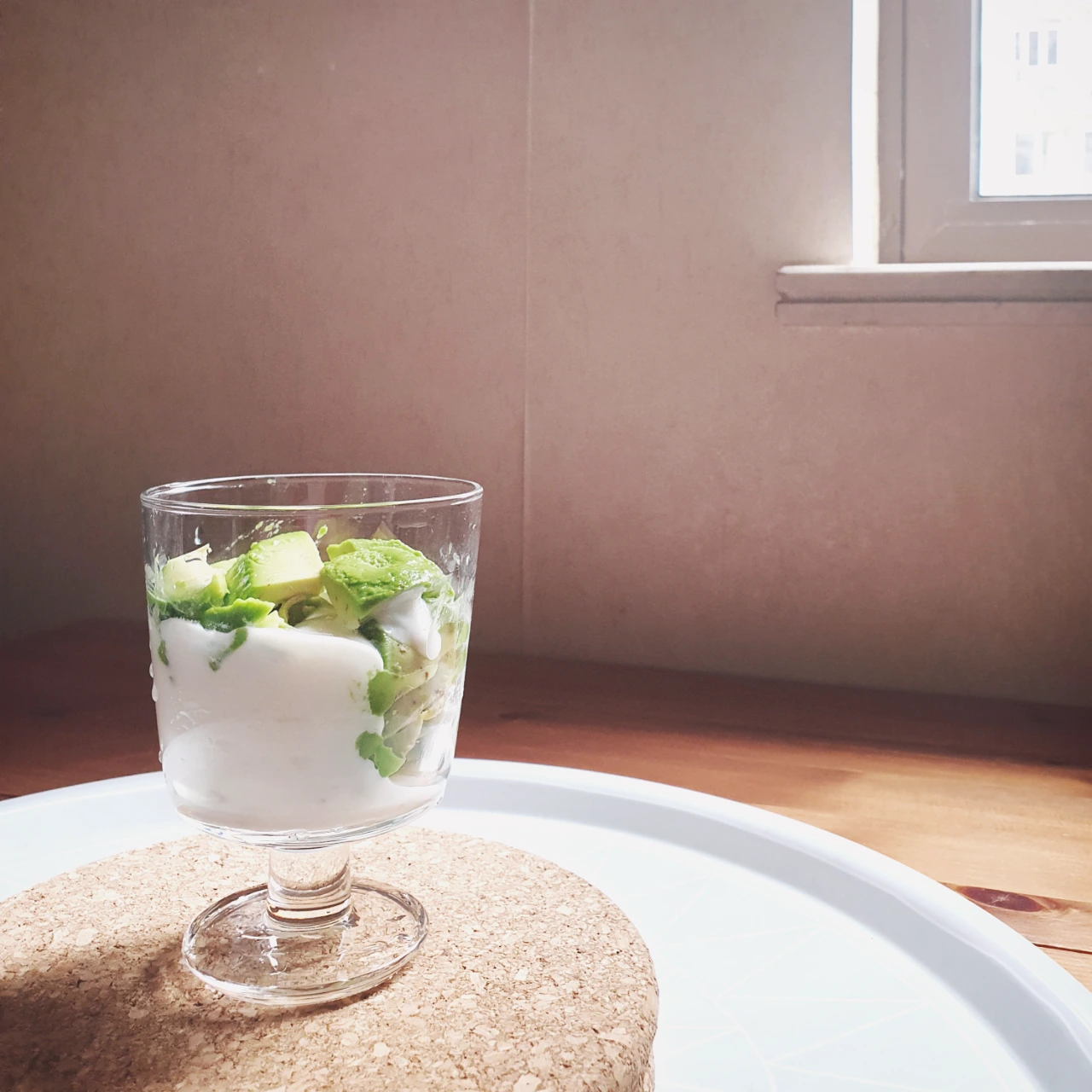 스스럼 없이 속살을 보여주는 잘 익은 아보카도 한 개를 송송 썰어, 이케아에서 산 입구가 넓은 유리잔에 담는다. 그리고 친구가 사놓은 망고 요거트를 그 위에 가득 부어본다.