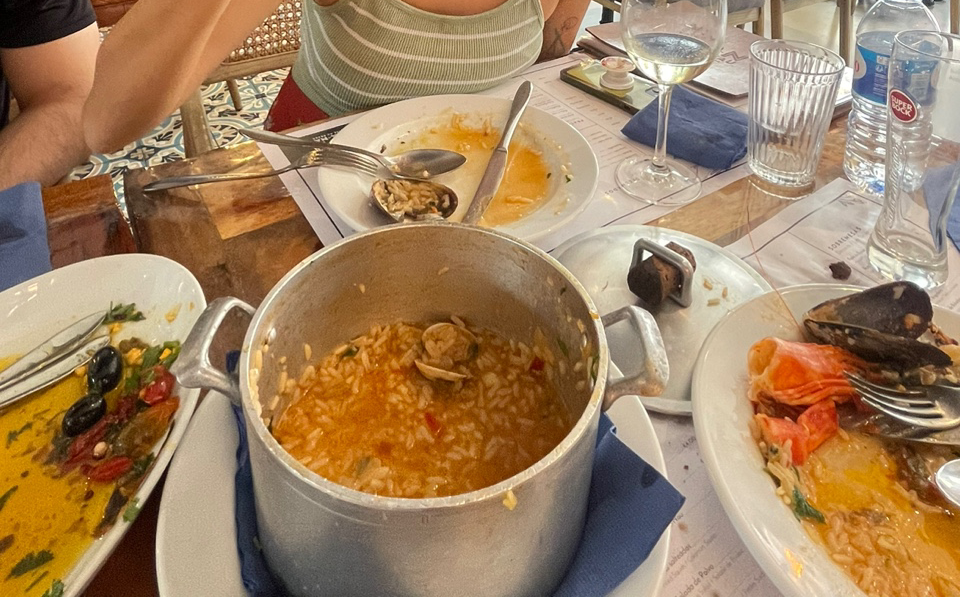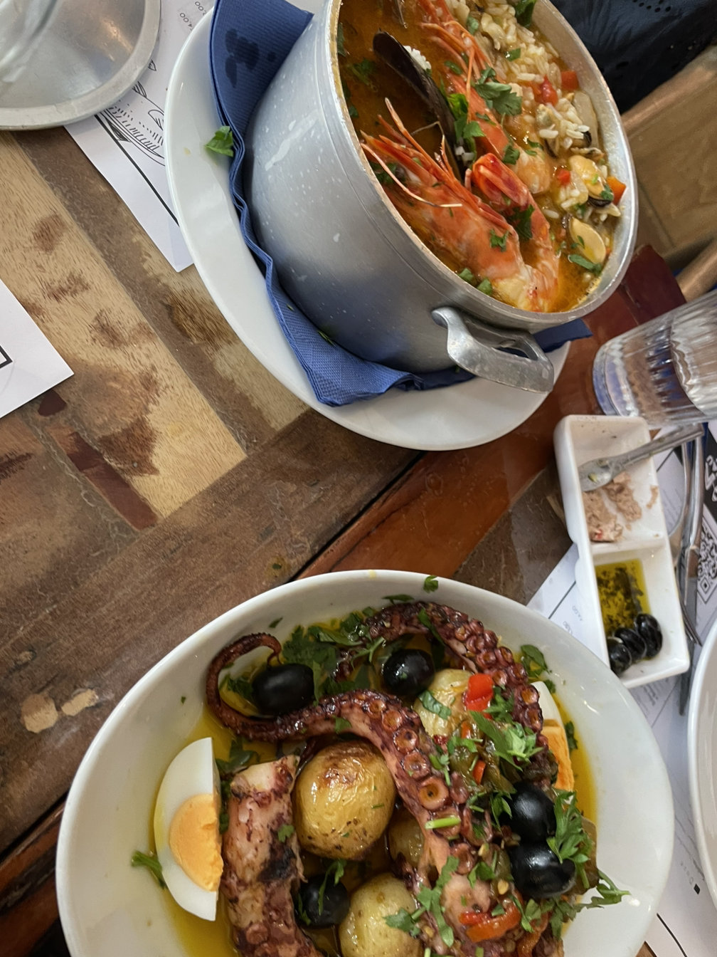 레스토랑은 의외로 내부가 널찍했다. 깔끔한 인테리어와 단정한 차림새의 웨이터에 기대감이 고조됐다. 무엇보다도 이미 자리 잡아 식사를 즐기고 있는 손님들 테이블을 장식한 음식의 자태가 어찌나 영롱하던지 침이 꼴깍꼴깍 넘어갔다. 선택의 시간은 참으로도 행복에 겨운 고통이었다. 물론 여태 포르투갈에서 해산물 음식을 다양하게 먹어왔다지만 이 곳은 아주 제대로 된, 그러니까 정통 해산물 집이란 걸 메뉴만 봐도 단박에 알 수 있었다. 본격적이었다. 우린 겨우 메뉴를 추리는 데 성공한다. 해물밥, 문어 샐러드, 농어 구이, 대구 요리. 줄줄이 주문한 요리가 도착했다. 상 다리가 휘어도 한참을 휘어질 차림이었다.