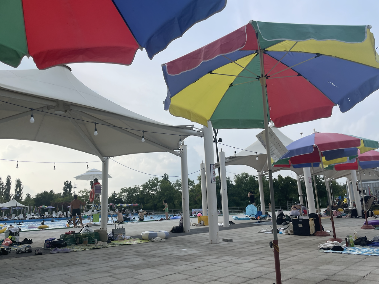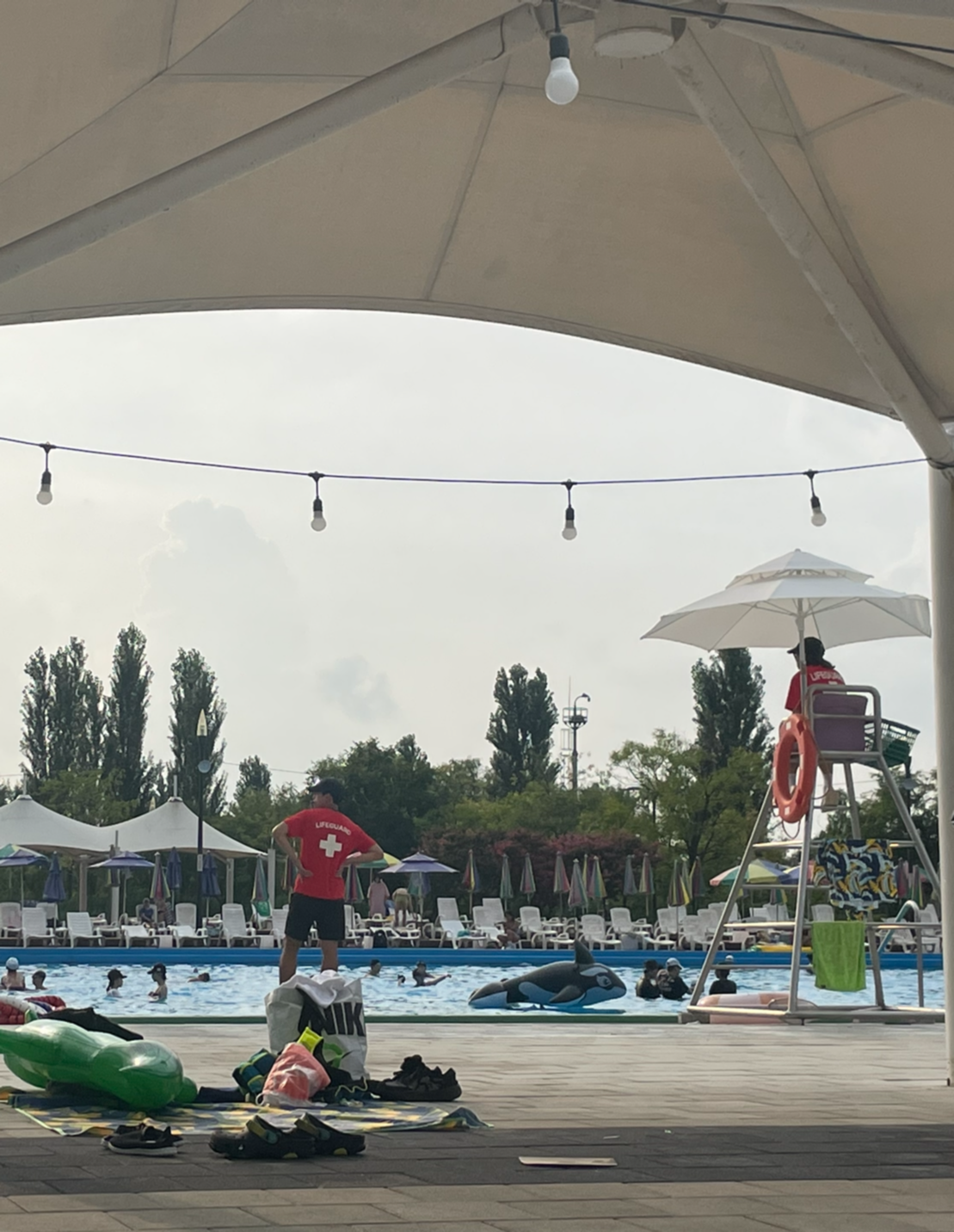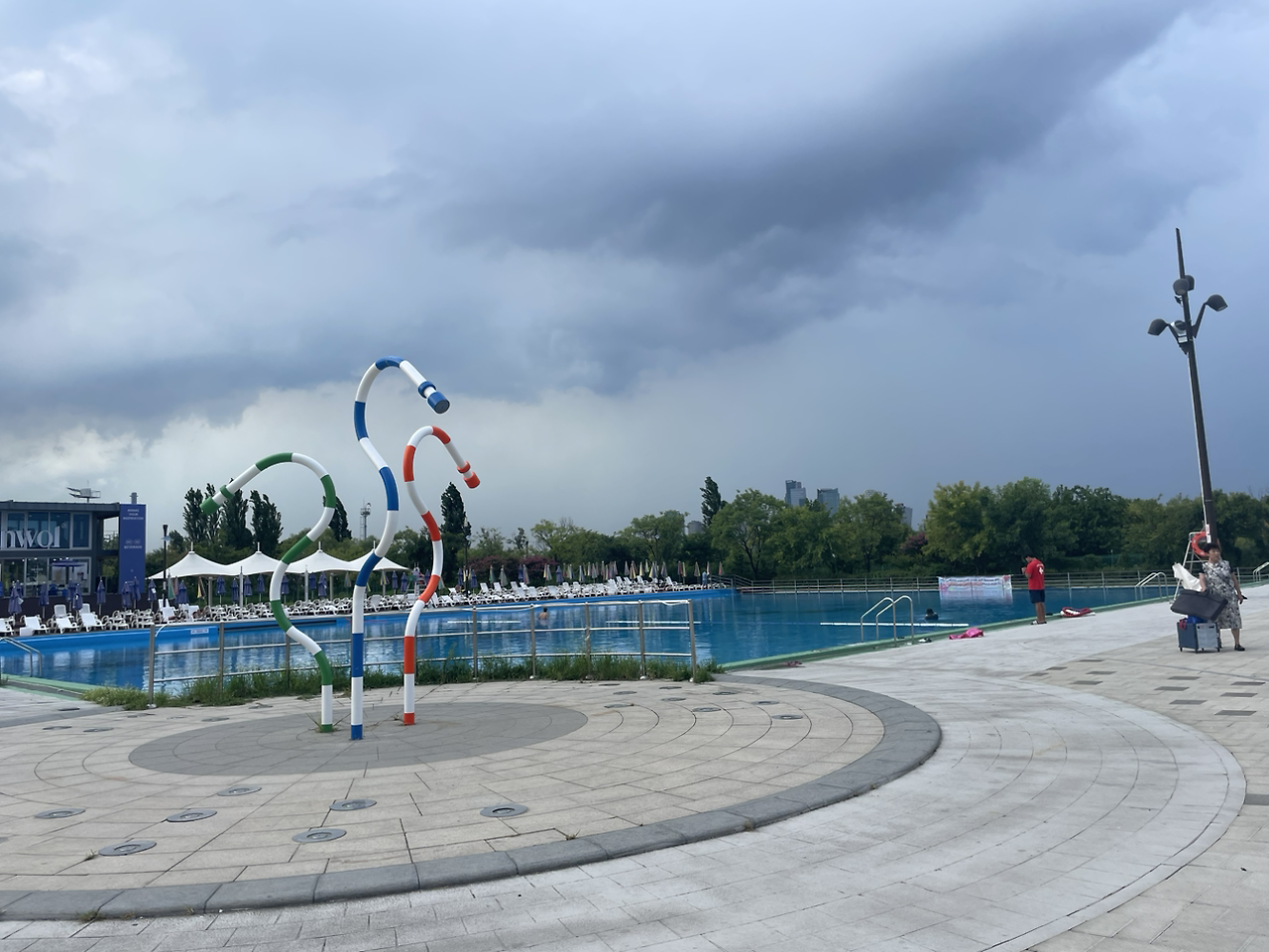 그로부터 일주일 뒤에 여의도 한강 수영장을 다시 찾게 되었다. 그 주에 한강 수영장 시즌이 마감된다고 하니 그전에 한 번이라도 더 가고 싶은 마음이 들어서 급하게 다시 찾게 되었다. 여의도 한강 수영장은 낮에 가보기로 했다. 사람들도 더 적을 것 같았고, 야간 시간대를 경험하고 나니 낮 시간대의 모습도 알고 싶어졌다. 잠원 한강 수영장은 우리 집에서 대중교통으로 한 시간 조금 더 걸리는데 가는 길이면 몰라도 오는 길에는 제대로 샤워도 하지 않아 꿉꿉한 상태로 오게 돼서 영 불편해서 한강 공원 주차장도 널찍하겠다 여의도 수영장에는 차를 끌고 가보기로 했다. 초보운전자로서는 크나큰 결심이 아닐 수가 없다. 수영 가는 길이니까 가방에 이것저것 챙겨 넣어야 하는데 차가 있으니 짐을 싣는데 큰 부담이 없어 가는 길은 편하게 갔다. 오는 길에 그렇게 교통체증이 심할 줄 알았으면 한 번 더 생각해 볼 일이긴 했지만 말이다. 여의도 한강 수영장도 마찬가지로 수영을 즐기는 사람들이 가기에는 제격인 수영장이었다. 수심도 깊고, 수영장도 적당히 널찍하다. 지난번에는 제대로 준비물을 챙겨가지 않아 콘크리트 맨바닥에 앉아 있어야 했다. 시멘트 감성이 주는 낭만과 궁상의 기묘한 조합을 즐기기는 했다만 이번에는 잊지 않고 돗자리를 챙겨 와 일단 자리를 널찍이 펼치고 시작했다. 그나마도 준비해 온 거긴 했으나 옆 자리 보면 한강 수영장 고인 물일수록 장비와 준비물이 현란하고도 화려해 보이긴 했다. 내내 국지성 호우가 내리는 기간이었어서 오후가 되면 어김없이 장대비가 거세게 내리고는 했는데 아니나 다를까 이 날도 별안간 천둥번개가 내리치기 시작했다. 감전의 위험이 있다는 안전상의 이유로 이 날 주간 타임은 이른 퇴장을 했어야 했다. 그나마 다행인 건 5시 30분이 마지막 퇴장 시간이었는데 비가 느지막이 들이치기 시작해 5시 넘어서까지는 놀 수 있었다는 거다. 한강 수영장은 45분 동안 열고 15분은 청소하는 시간이어서 이용객은 잠시 밖에서 대기해야 한다. 안 그래도 생각보다 늦게 도착해 두 타임 밖에 못 놀았는데 자리 깔자마자 비 오기 시작했으면 아쉬움만 가득 남기고 집으로 돌아가야 했을 거다.