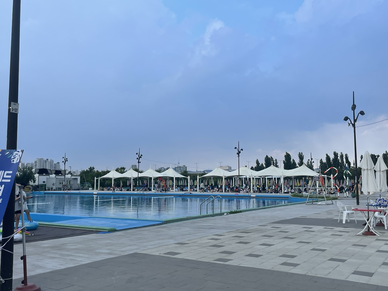 잠원 한강 수영장은 개 중 수용 인원도 많고, 수영장 크기도 커서 사람들이 많이 찾는 곳 중 하나였다. 한강 수영장마다 살짝씩 수영장의 크기나 깊이가 달라 누구랑 언제 가는지에 따라서도, 내가 어떤 수영장을 더 선호하는지에 따라서도 더 잘 맞는 장소가 있을 것 같다. 나는 친구들과 가는 데다가 다들 수영을 즐기는 사람들이어서 깊고 널찍한 잠원 한강 수영장을 고른 건 적절한 선택 같았다. 같은 장소여도 주간과 야간에 볼 수 있는 풍경은 다르기 때문에 저녁 6시 이후에 열리는 야간 개장 시즌도 꼭 체험해 보고 싶기도 해서 우린 6시에 만나 먹거리를 몇 개 사서 입장했다. 사람들이 많을 거라고는 생각했지만 입장 줄부터 바글바글했고, 입장한 뒤에 눈으로만 훑어보아도 이미 수영장이 빽빽하게 차 있어서 제대로 된 수영이라기보다는 한강 수영장 체험에 의의를 두어야겠다고 일찍이 마음을 먹었다. 실제로 주변 사람들과의 거리 유지 때문에 수영보다는 친구들하고 물속에서 서로 업어주고 던져주면서 시간을 보내게 되었는데 밤 시간대의 한강 수영장은 이런 맛으로 가는 거겠거니 싶어서 아쉬운 건 없었다. 전에 한강 수영장을 즐겨 간다던 다른 친구가 평일 오전에 시간을 낼 수 있다면 수영장 전세 낼 수 있다고 한 적이 있었는데 그렇게 하루 날 잡고 놀아도 재밌을 것 같았다. 먹거리는 공원 바깥에 나가지 않고서도 옆에 푸드 트럭에서 얼마든지 사 올 수 있고, 돗자리만 펼쳐 놓는다면 수영 말고도 볕 맞으며 다른 활동을 할 수 있으니 수영을 곁들인 피크닉을 즐길 수 있게 된다.