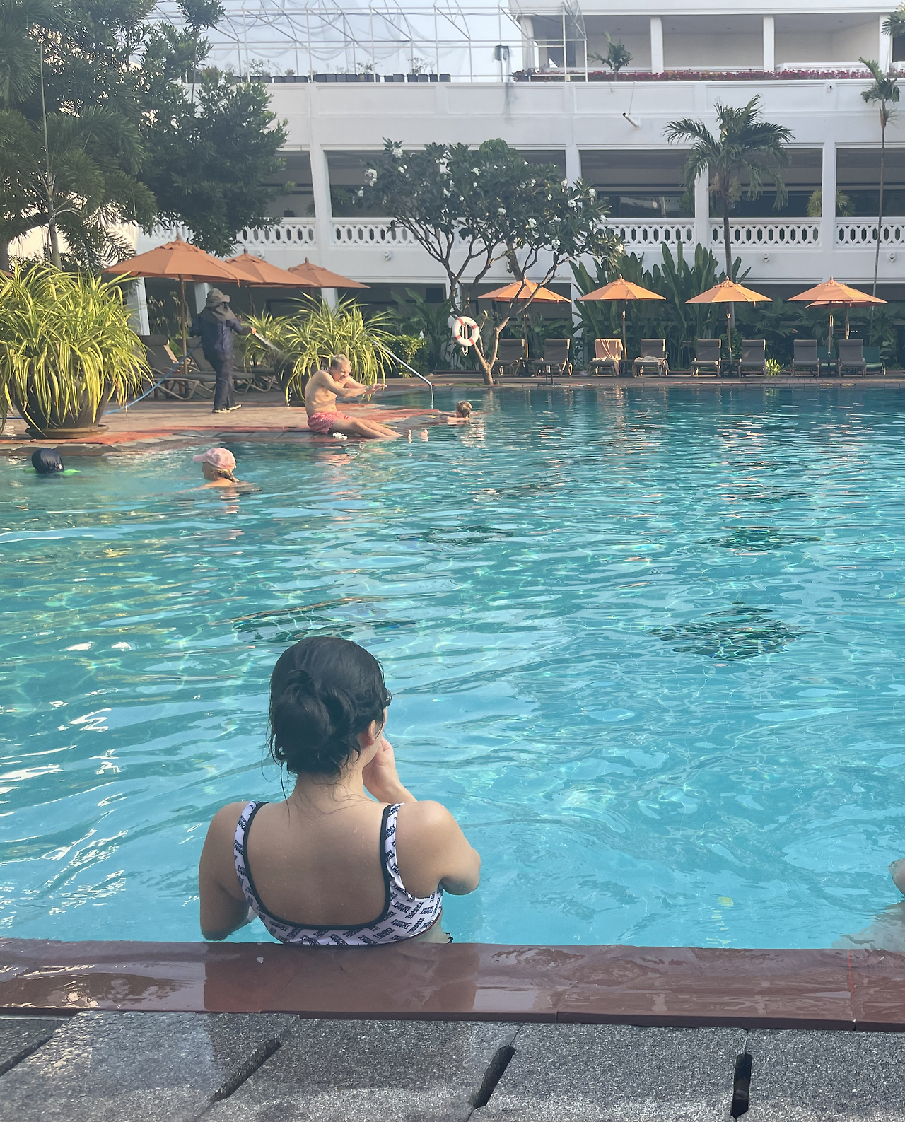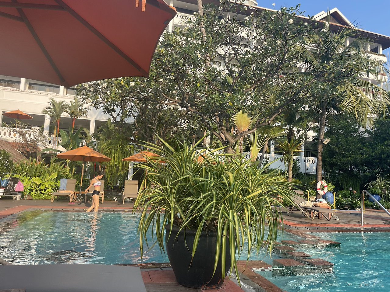 바로 수영복만 입고 길을 나섰다. 우린 2층에 묵었기 때문에 계단으로 내려가 통로만 건너면 수영장이 나왔다.
