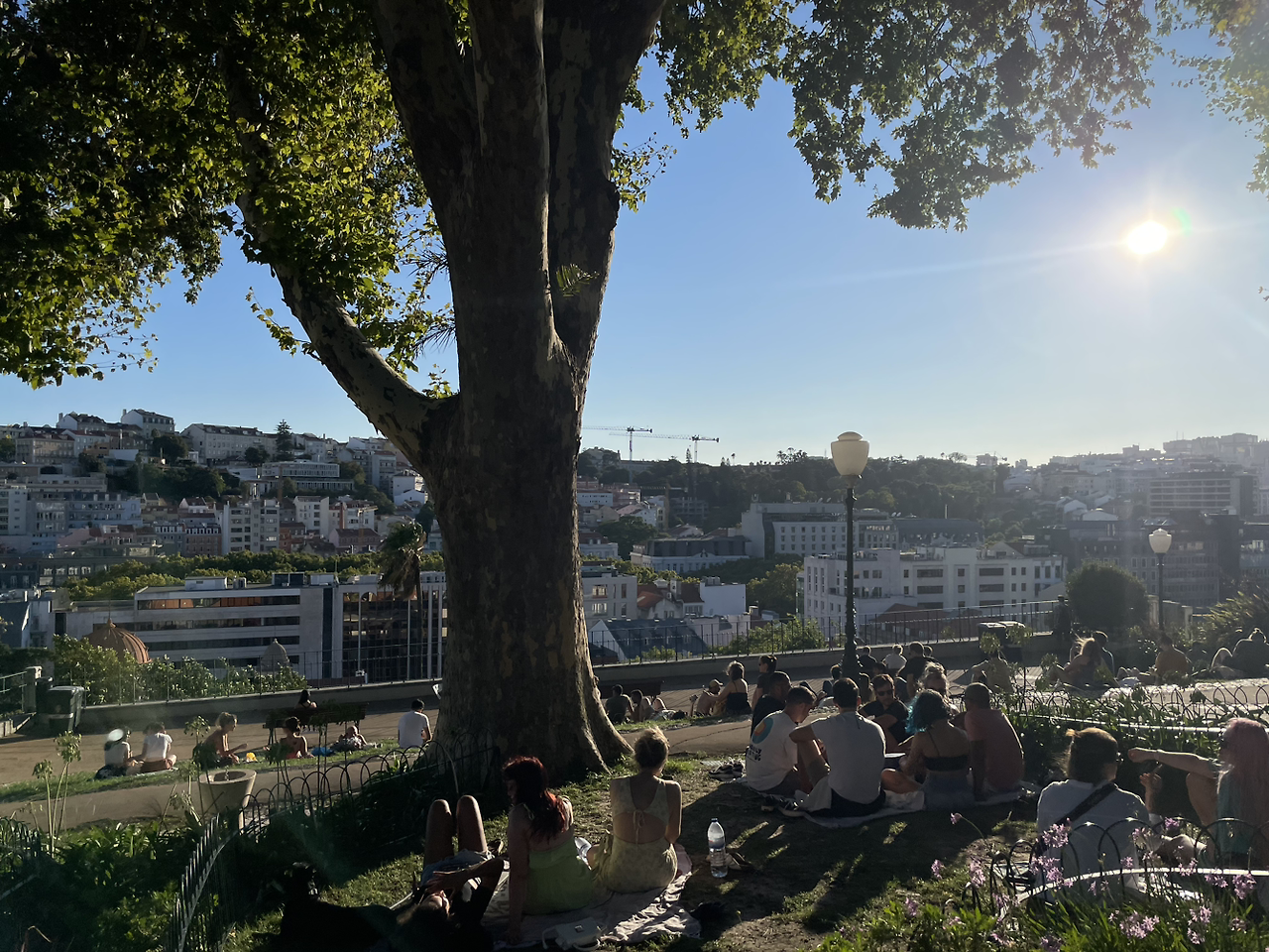 첫 눈에 보면 조금 심심해 보일 수 있는 공원이다. 뮤직비디오에서 연출된 눈부신 화려함과 화사한 반짝거림과도 거리가 멀다. 모든 걸 분홍빛으로 만들어주는 필터를 빼고 난 뒤 민낯의 공원이니 그럴 수 밖에 없다. 하지만 공원의 빈 분수대나 좁은 길이 나있는 잔디밭은 나름대로의 소담한 멋이 있었다. 뮤직비디오 속 청량한 분수대와 그 앞 광장을 가득 메운 사람들은 없다. 하지만 물이 빠진 분수대 안에서 롤러스케이트를 타는 사람과 분수대 담벼락 위에서 햇살을 맞으며 누워있는 사람들은 있다. 공원 잔디밭은 뮤직 비디오 장면처럼 싱그럽고 푸릇하지는 않다. 그래도 그 위에 사람들은 돗자리를 펴고 옹기종기 앉아 이야기를 나누거나 기타를 연주하며 잔잔한 노을 지는 저녁을 즐긴다. 채도와 밝기를 최대치로 높인 필터를 끼운 리스본보다 자연광을 받으며 빛나는 무보정의 리스본이 아름답다. 높은 지대의 가장 높은 곳에 있는 공원에서 리스본 구석구석을 살펴 보았다. 본 모습 그대로의 리스본을 맨 눈에 담을 수 있는 건 행운이라고 생각하며 공원이 문 닫는 시간에 맞추어 뒷문으로 빠져 나왔다.