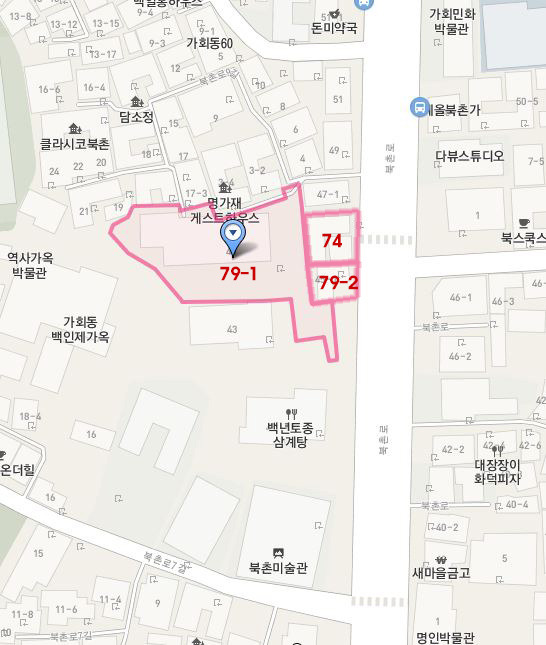 이 주택의 위치는 가회동 79-1 번지인데 얼마 전 아모레퍼시픽은 그 옆에 있는 79-2 번지 한옥도 매입했고, 74번지도 매입했다. 이 건물 주변에 나온 매물을 싹쓸이했다.